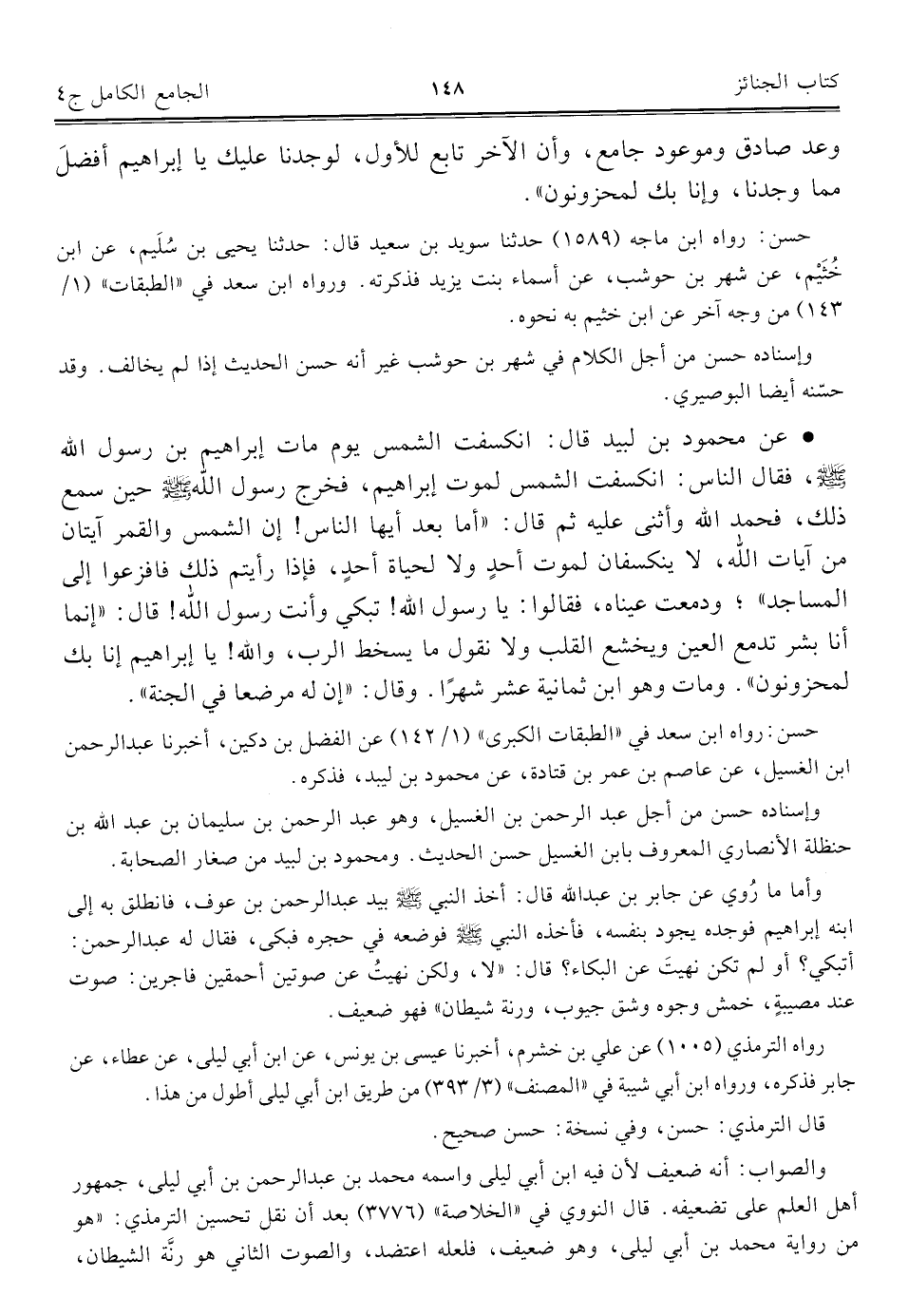وأما ما رُوي عن جابر بن عبد الله قال: أخذ النبي صلى الله عليه وسلم بيد عبد الرحمن بن عوف، فانطلق به إلى ابنه إبراهيم فوجده يجود بنفسه، فأخذه النبي صلى الله عليه وسلم فوضعه في حجره فبكى، فقال له عبد الرحمن: أتبكي؟ أو لم تكن نهيتَ عن البكاء؟ قال: "لا، ولكن نهيتُ عن صوتين أحمقين فاجرين: صوت عند مصيبة، خمش وجوه وشق جيوب، ورنه شيطان" فهو ضعيف.