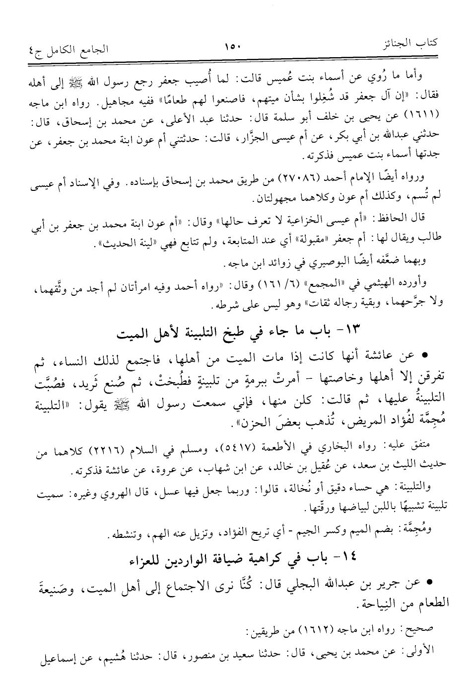 • عن جرير بن عبد الله البجلي قال: كُنَّا نرى الاجتماع إلى أهل الميت، وصَنيعةَ الطعام من النِياحة.