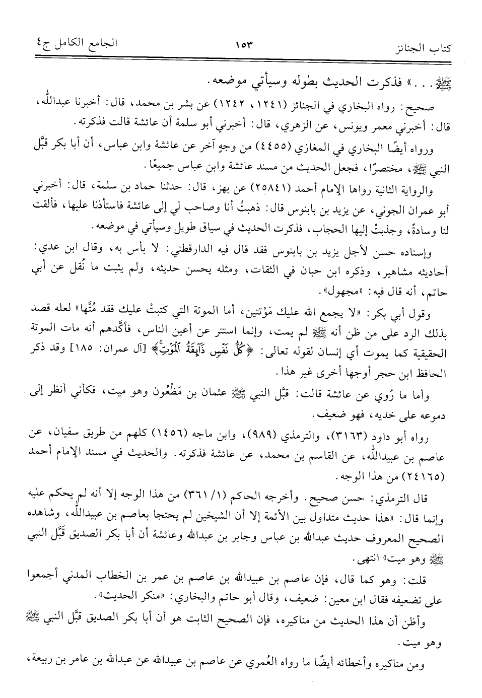 وأظن أن هذا الحديث من مناكيره، فإن الصحيح الثابت هو أن أبا بكر الصديق قبل النبي صلى الله عليه وسلم وهو ميت.
