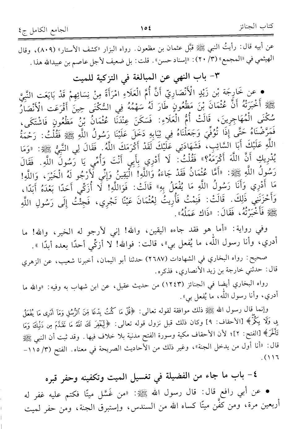 • عن خَارِجَة بْن زَيْدٍ الْأَنْصَارِيّ أَنَّ أُمَّ الْعَلاءِ امْرَأَةً مِنْ نِسَائِهمْ قَدْ بَايَعَت النَّبِيَّ - صلى الله عليه وسلم - أَخْبَرَتْهُ أَنَّ عُثْمَانَ بْنَ مَظْعُونٍ طَارَ لَهُ سَهْمُهُ فِي السُّكْنَى حِينَ أَقْرَعَت الْأَنْصَارُ سُكْنَى الْمُهَاجِرِينَ، قَالَتْ أُمُّ الْعَلاءِ: فَسَكَنَ عِنْدَنَا عُثْمَانُ بْنُ مَظْعُونٍ فَاشْتَكَى، فَمَرَّضْنَاهُ حَتَّى إِذَا تُوُفِّيَ وَجَعَلْنَاهُ فِي ثِيَابِهِ دَخَلَ عَلَيْنَا رَسُولُ اللهِ - صلى الله عليه وسلم - فَقُلْتُ: رَحْمَةُ اللهِ عَلَيْكَ أبَا السَّائِبِ، فَشَهَادَتِي عَلَيْكَ لَقَدْ أَكْرَمَكَ اللهُ. فَقَالَ لِي النَّبِيُّ - صلى الله عليه وسلم -: "وَمَا يُدْرِيكِ أَنَّ اللهَ أَكْرَمَهُ؟ " فَقُلْتُ: لا أَدْرِي بِأَبِي أَنْتَ وَأُمِّيِ يَا رَسُولَ اللهِ. فَقَالَ رَسُولُ اللهِ - صلى الله عليه وسلم -: "أَمَّا عُثْمَانُ فَقَدْ جَاءهُ وَاللهِ! الْيَقِينُ وَإِنِّي لأَرْجُو لَهُ الْخَيْرَ، وَاللهِ! مَا أدْرِي وَأَنَا رَسُولُ اللهِ مَا يُفْعَلُ بِهِ" قَالَتْ: فَوَاللهِ! لَا أُزَكِّي أَحَدًا بَعْدَهُ أَبَدًا، وَأَحْزَنَنِي ذَلِكَ. قَالَتْ: فَنِمْتُ فَأُرِيتُ لِعُثْمَانَ عَيْنًا تَجْرِي، فَجِئْتُ إلَى رَسُولِ اللهِ - صلى الله عليه وسلم - فَأَخْبَرْتُهُ، فَقَالَ: "ذَاك عَمَلُهُ".