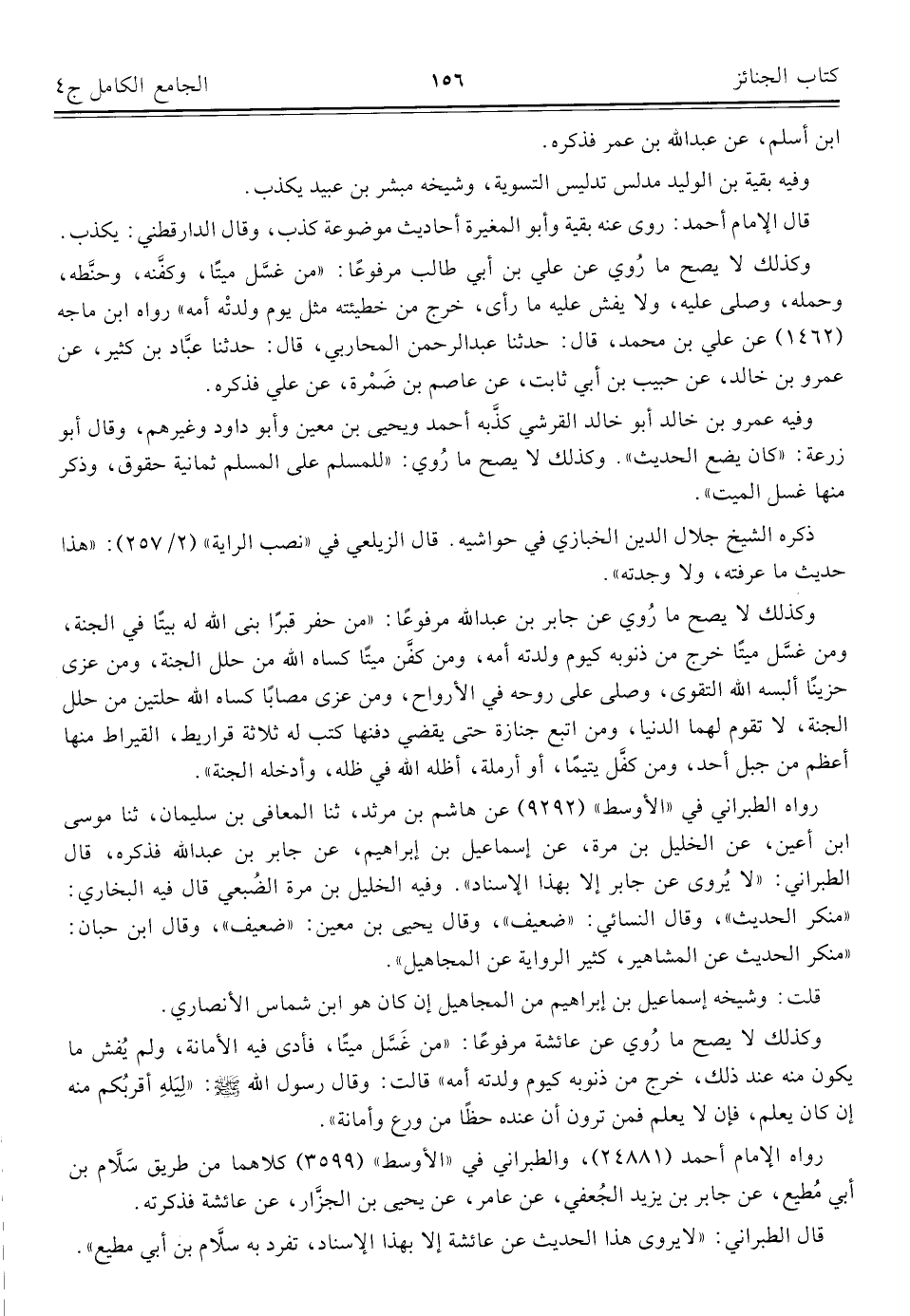 وفيه عمرو بن خالد أبو خالد القرشي كذَّبه أحمد ويحيى بن معين وأبو داود وغيرهم، وقال أبو زرعة: "كان يضع الحديث". وكذلك لا يصح ما رُوي: "للمسلم على المسلم ثمانية حقوق، وذكر منها غسل الميت".
