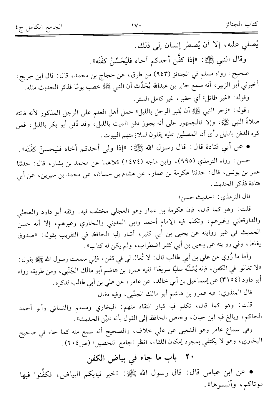 وأما ما رُوي عن علي بن أبي طالب قال: لا تُغال لي في كفن، فإني سمعت رسول الله - صلى الله عليه وسلم - يقول: "لا تغالوا في الكفن، فإنه يُسْلَبُه سلبًا سريعًا" ففيه عمرو بن هاشم أبو مالك الجَنْبي، ومن طريقه رواه أبو داود (٣١٥٤) عن إسماعيل بن أبي خالد، عن عامر، عن علي بن أبي طالب فذكره.