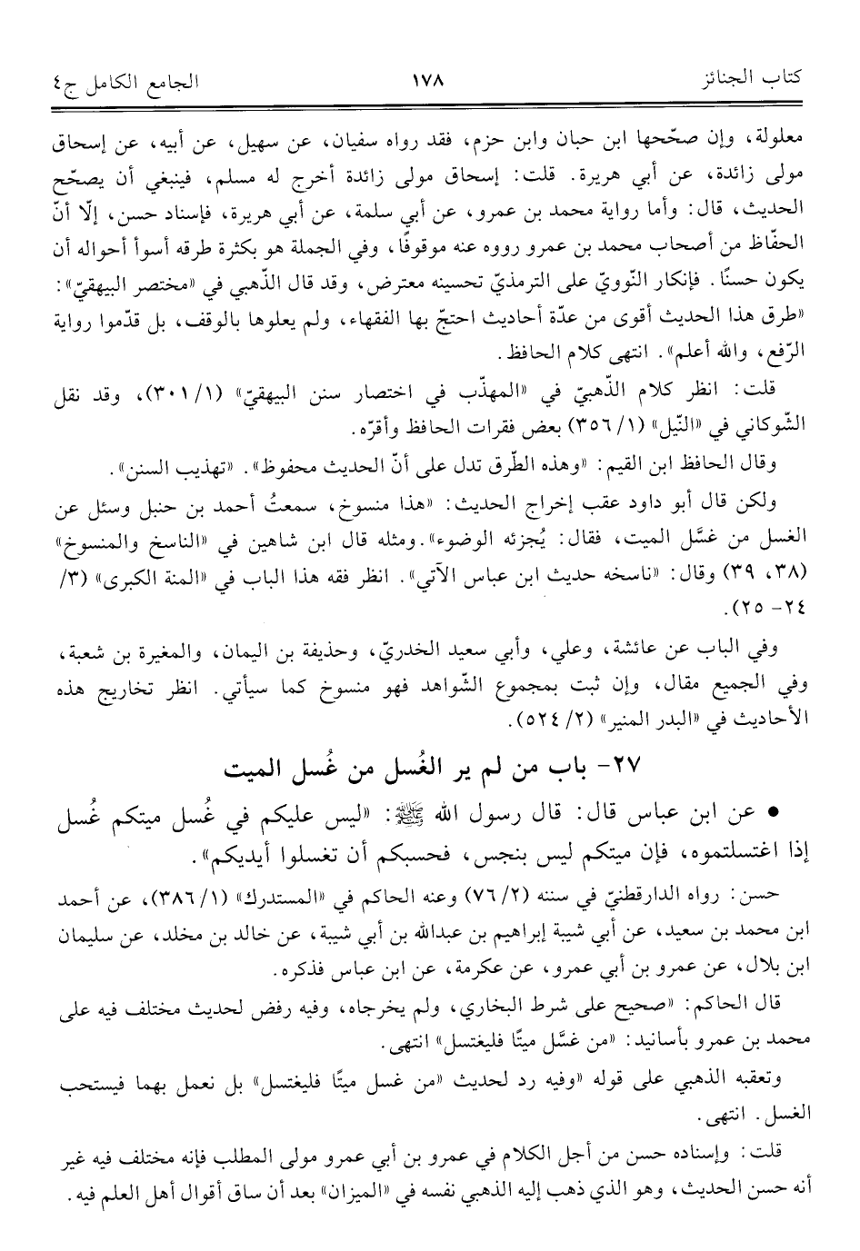 قال الحاكم: "صحيح على شرط البخاريّ، ولم يخرجاه، وفيه رفض لحديث مختلف فيه على محمد بن عمرو بأسانيد: "من غسَّل ميتًا فليغتسل" انتهى.