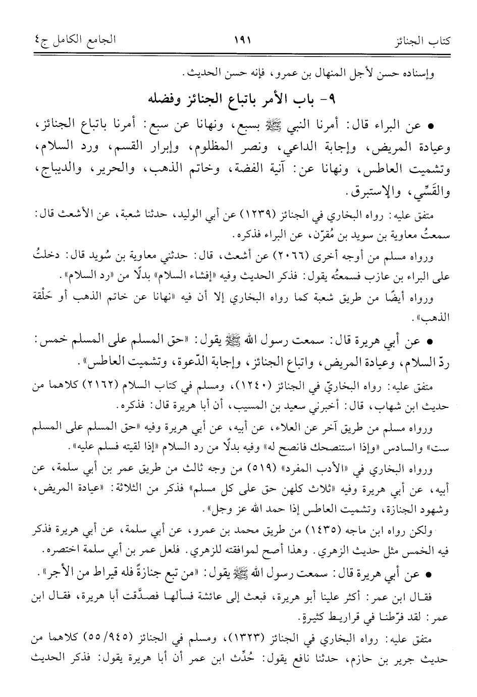 ٩ - باب الأمر باتباع الجنائز وفضله