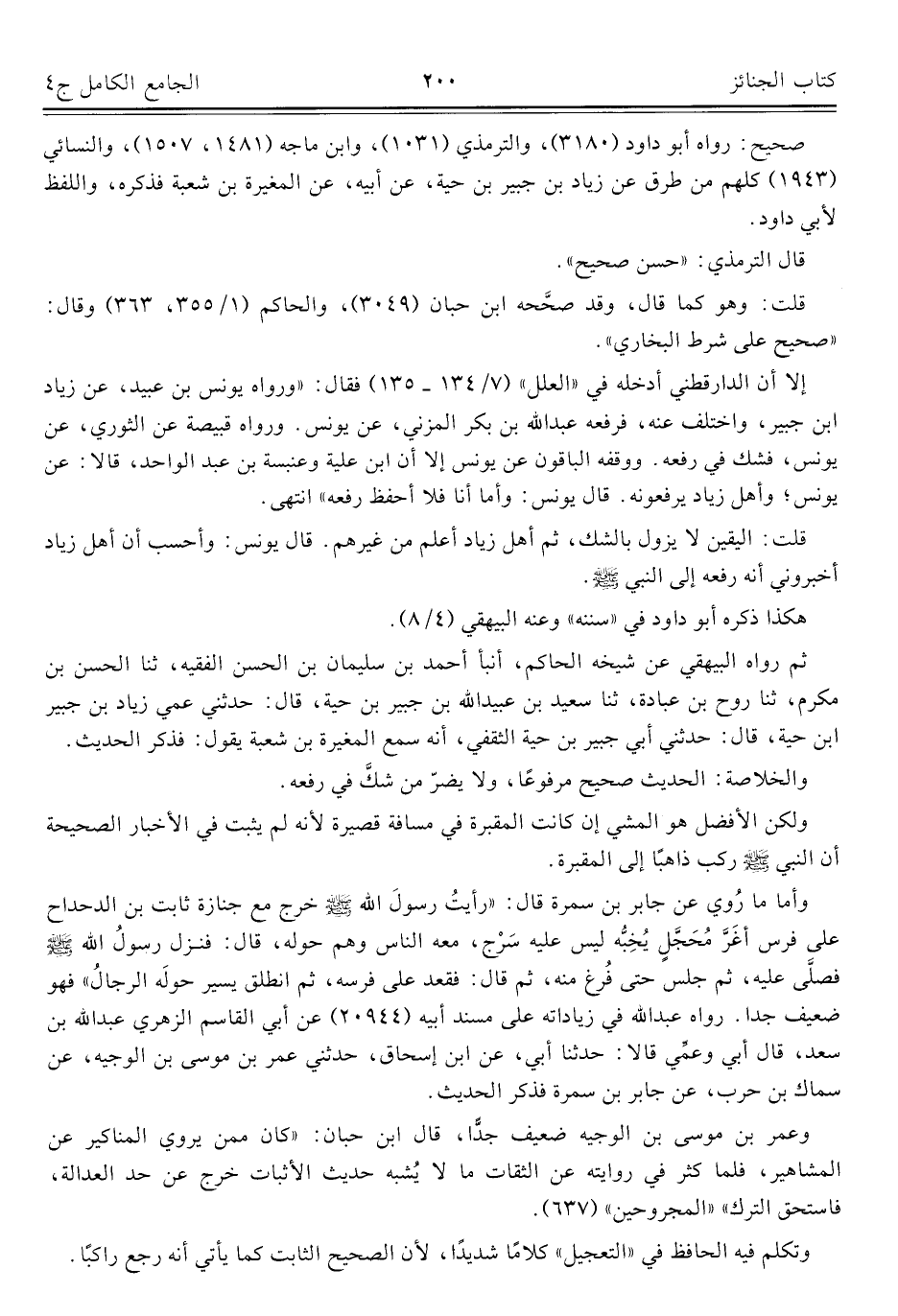 وأما ما رُوي عن جابر بن سمرة قال: "رأيتُ رسول الله -صلي الله عليه وسلم- خرج مع جنازة ثابت بن الدحداح على فرس أغَرَّ مُحَجَّلٍ يُخِبُّه ليس عليه سَرْج، معه الناس وهم حوله، قال: فنزل رسولُ الله -صلي الله عليه وسلم- فصلَّى عليه، ثم جلس حتى فُرغ منه، ثم قال: فقعد على فرسه، ثم انطلق يسير حولَه الرجالُ" فهو ضعيف جدا. رواه عبد الله في زياداته على مسند أبيه (٢٠٩٤٤) عن أبي القاسم الزهري عبد الله بن سعد، قال أبي وعمِّي قالا: حدثنا أبي، عن ابن إسحاق، حدثني عمر بن موسي بن الوجيه، عن سماك بن حرب، عن جابر بن سمرة فذكر الحديث.