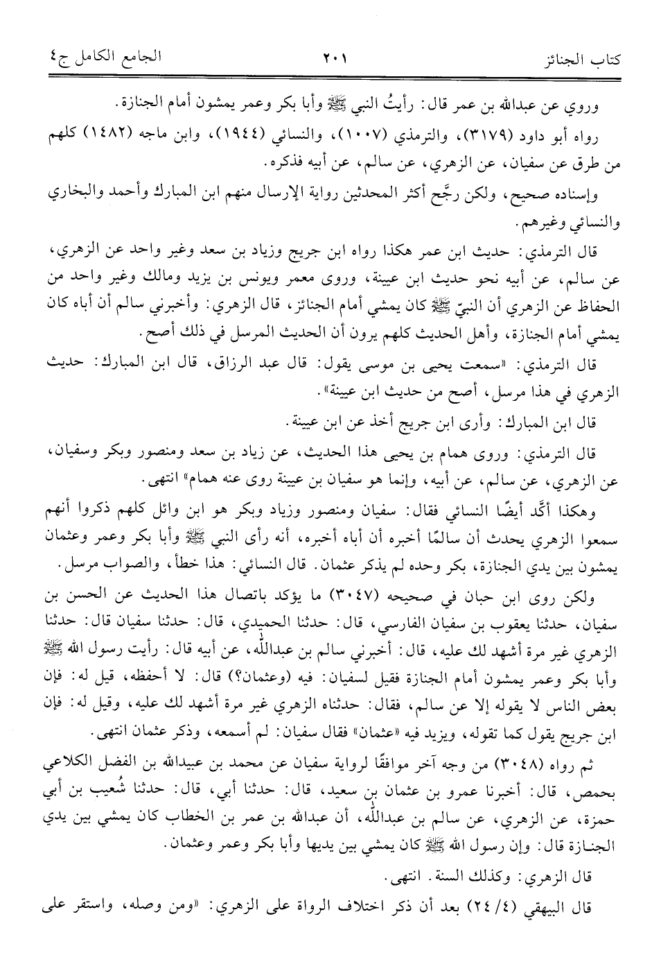 وهكذا أكَّد أيضًا النسائي فقال: سفيان ومنصور وزياد وبكر هو ابن وائل كلهم ذكروا أنهم سمعوا الزهري يحدث أن سالمًا أخبره أن أباه أخبره، أنه رأى النبي -صلي الله عليه وسلم- وأبا بكر وعمر وعثمان يمشون بين يدي الجنازة، بكر وحده لم يذكر عثمان. قال النسائي: هذا خطأ، والصواب مرسل.