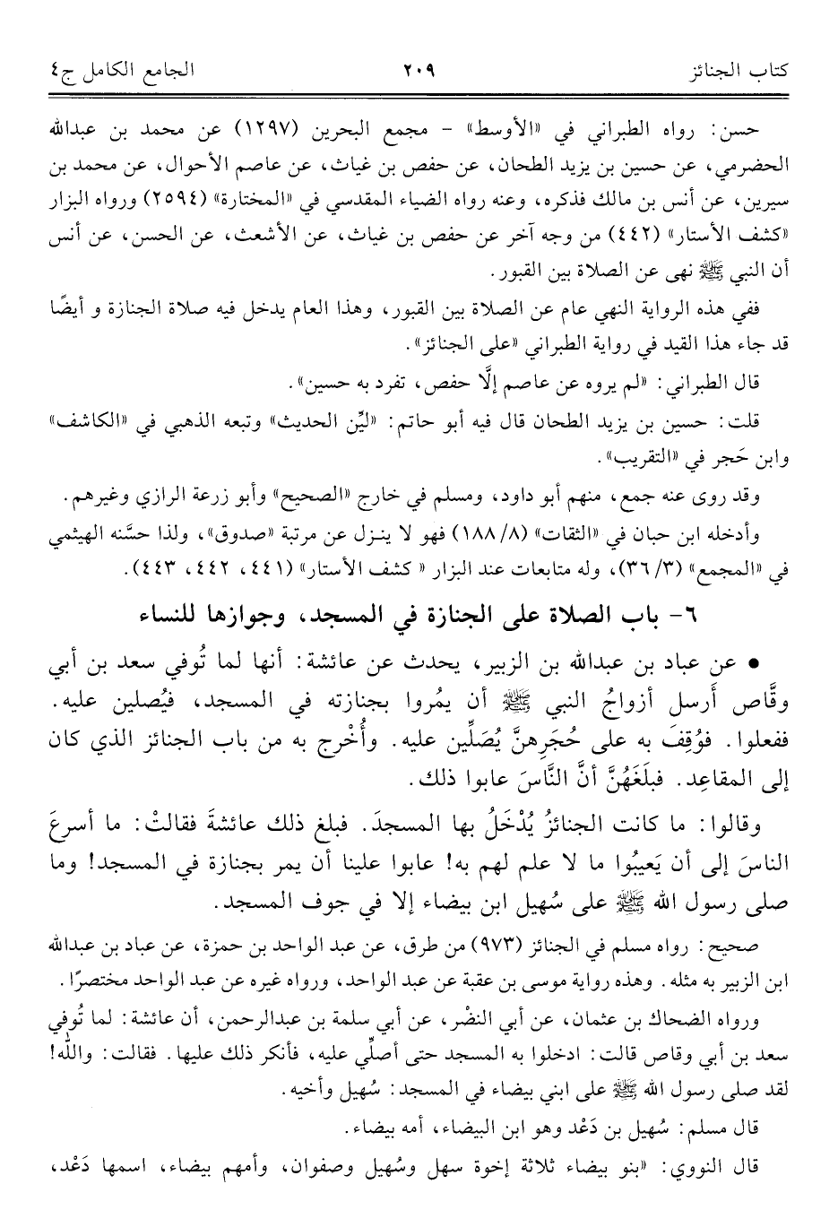 ورواه الضحاك بن عثمان، عن أبي النضْر، عن أبي سلمة بن عبد الرحمن، أن عائشة: لما تُوفي سعد بن أبي وقاص قالت: ادخلوا به المسجد حتى أصلِّي عليه، فأنكر ذلك عليها. فقالت: والله! لقد صلى رسول الله -صلي الله عليه وسلم- على ابني بيضاء في المسجد: سُهيل وأخيه.