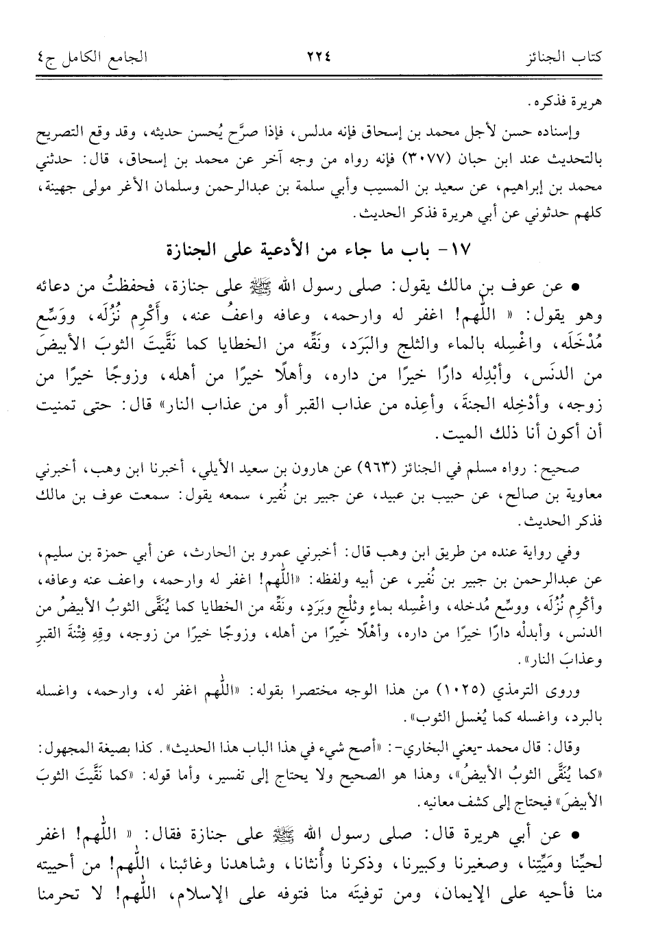 وفي رواية عنده من طريق ابن وهب قال: أخبرني عمرو بن الحارث، عن أبي حمزة بن سليم، عن عبد الرحمن بن جبير بن نفير، عن أبيه ولفظه: "اللهم! اغفر له وارحمه، واعف عنه وعافه، وأكرم نُزُلَه، ووسِّع مُدخله، واغسِله بماءٍ وثلجٍ وبَرَدٍ، ونَقِّه من الخطايا كما يُنَقَّى الثوبُ الأبيضُ من الدنس، وأبدله دارُا خيرًا من داره، وأهلًا خيرًا من أهله، وزوجًا خيرًا من زوجه، وقِهِ فتنةَ القبرِ وعذابَ النار".