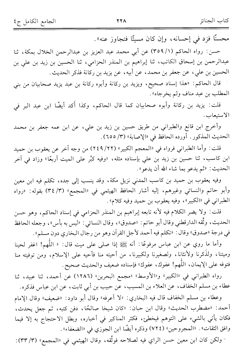قلت: وأما الطبراني فرواه في "المعجم الكبير" (٢٢/ ٢٤٩) من وجه آخر عن يعقوب بن حميد ابن كاسب، ثنا حسين بن زيد بن علي بإسناده مثله، "وفيه كبَّر على الميت أربعًا" وزاد في آخر الحديث: "ثم يدعو بما شاء الله أن يدعو".