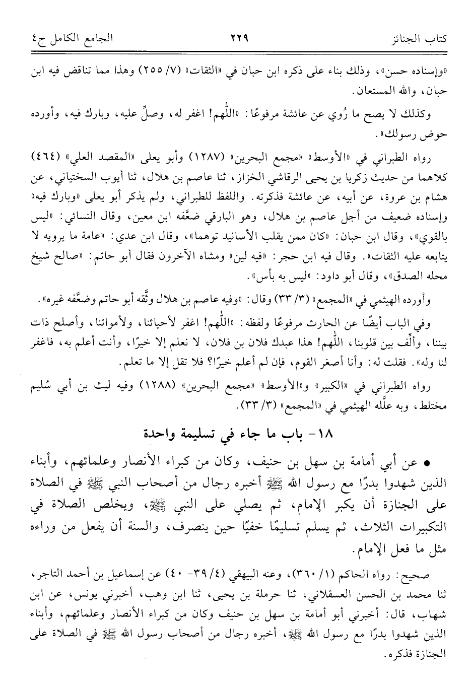 صحيح: رواه الحاكم (١/ ٣٦٠)، وعنه البيهقي (٤/ ٣٩ - ٤٠) عن إسماعيل بن أحمد التاجر، ثنا محمد بن الحسن العسقلاني، ثنا حرملة بن يحيى، ثنا ابن وهب، أخبرني يونس، عن ابن شهاب، قال: أخبرني أبو أمامة بن سهل بن حنيف وكان من كبراء الأنصار وعلمائهم، وأبناء الذين شهدوا بدرًا مع رسول الله - صلى الله عليه وسلم -، أخبره رجال من أصحاب رسول الله - صلى الله عليه وسلم - في الصلاة على الجنازة فذكره.