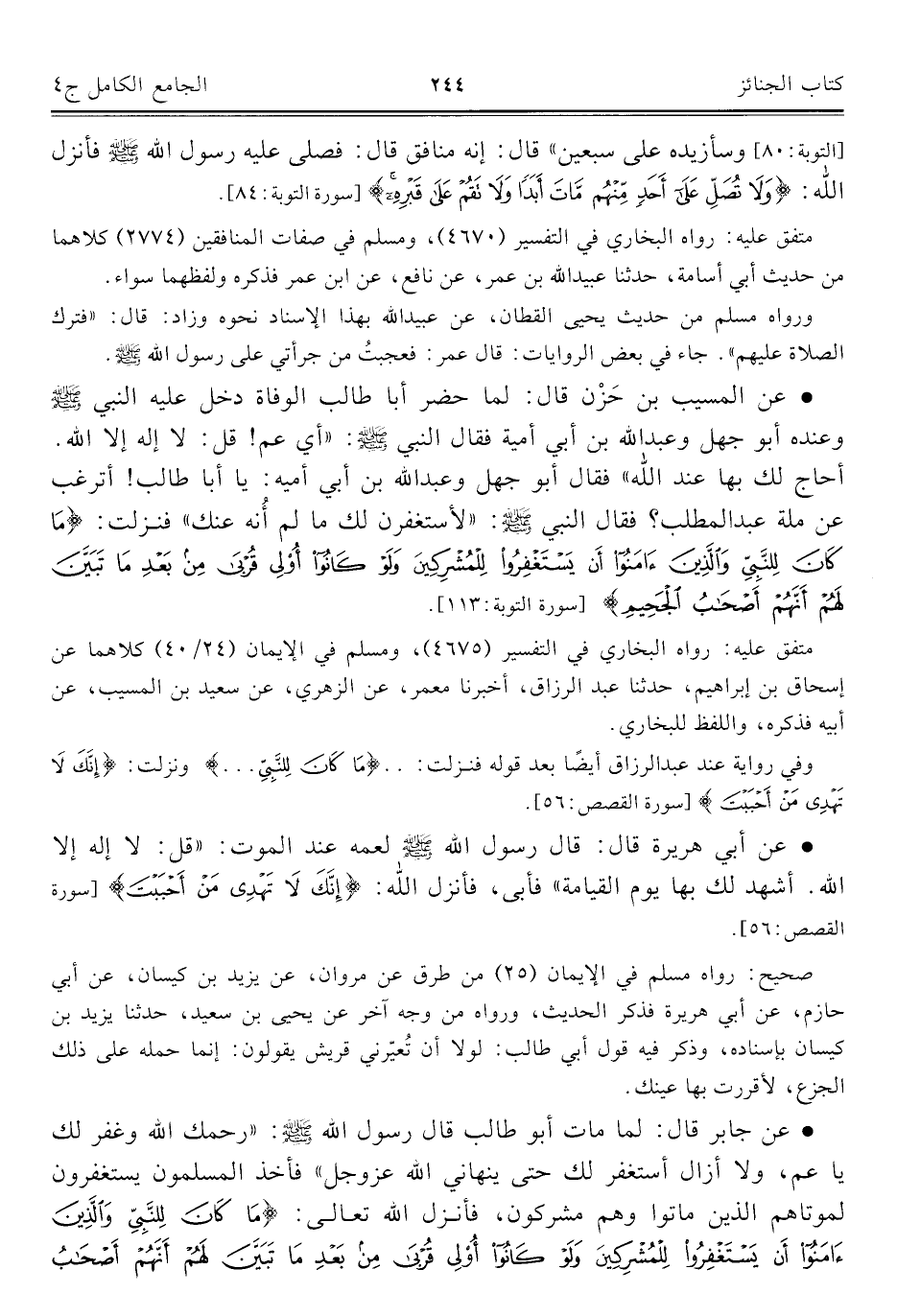 • عن المسيب بن حَزْن قال: لما حضر أبا طالب الوفاة دخل عليه النبي صلى الله عليه وسلم وعنده أبو جهل وعبد الله بن أبي أمية فقال النبي - صلى الله عليه وسلم -: "أي عم! قل: لا إله إلا الله. أحاج لك بها عند الله" فقال أبو جهل وعبد الله بن أبي أميه: يا أبا طالب! أترغب عن ملة عبد المطلب؟ فقال النبي - صلى الله عليه وسلم -: "لأستغفرن لك ما لم أُنه عنك" فنزلت: {مَا كَانَ لِلنَّبِيِّ وَالَّذِينَ آمَنُوا أَنْ يَسْتَغْفِرُوا لِلْمُشْرِكِينَ وَلَوْ كَانُوا أُولِي قُرْبَى مِنْ بَعْدِ مَا تَبَيَّنَ لَهُمْ أَنَّهُمْ أَصْحَابُ الْجَحِيمِ} [سورة التوبة: ١١٣].