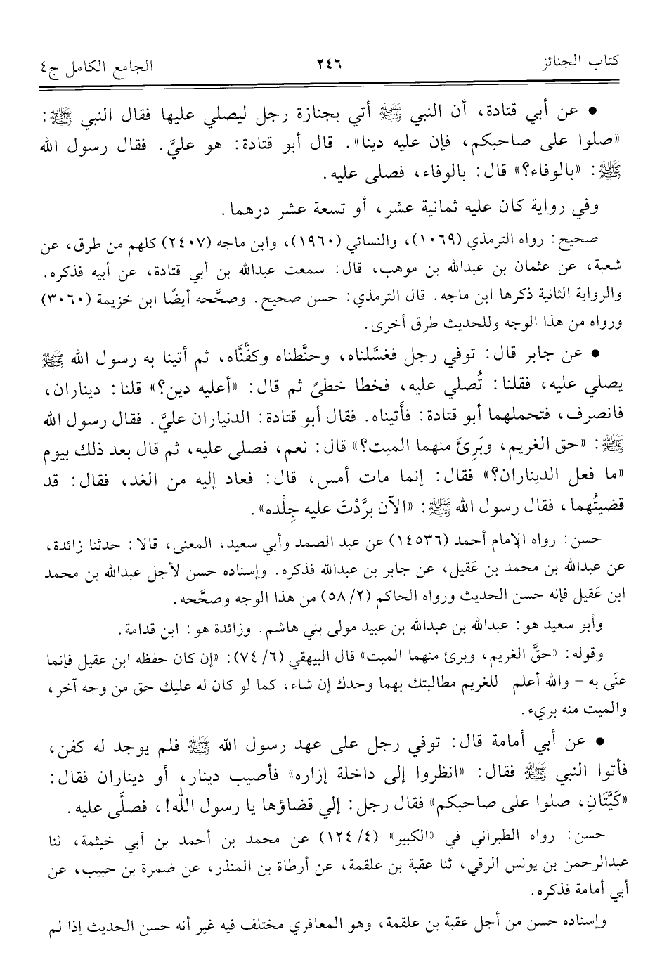 • عن أبي قتادة، أن النبي - صلى الله عليه وسلم - أتي بجنازة رجل ليصلي عليها فقال النبي - صلى الله عليه وسلم -: "صلوا على صاحبكم، فإن عليه دينا". قال أبو قتادة: هو عليَّ. فقال رسول الله - صلى الله عليه وسلم -: "بالوفاء؟ " قال: بالوفاء، فصلى عليه.