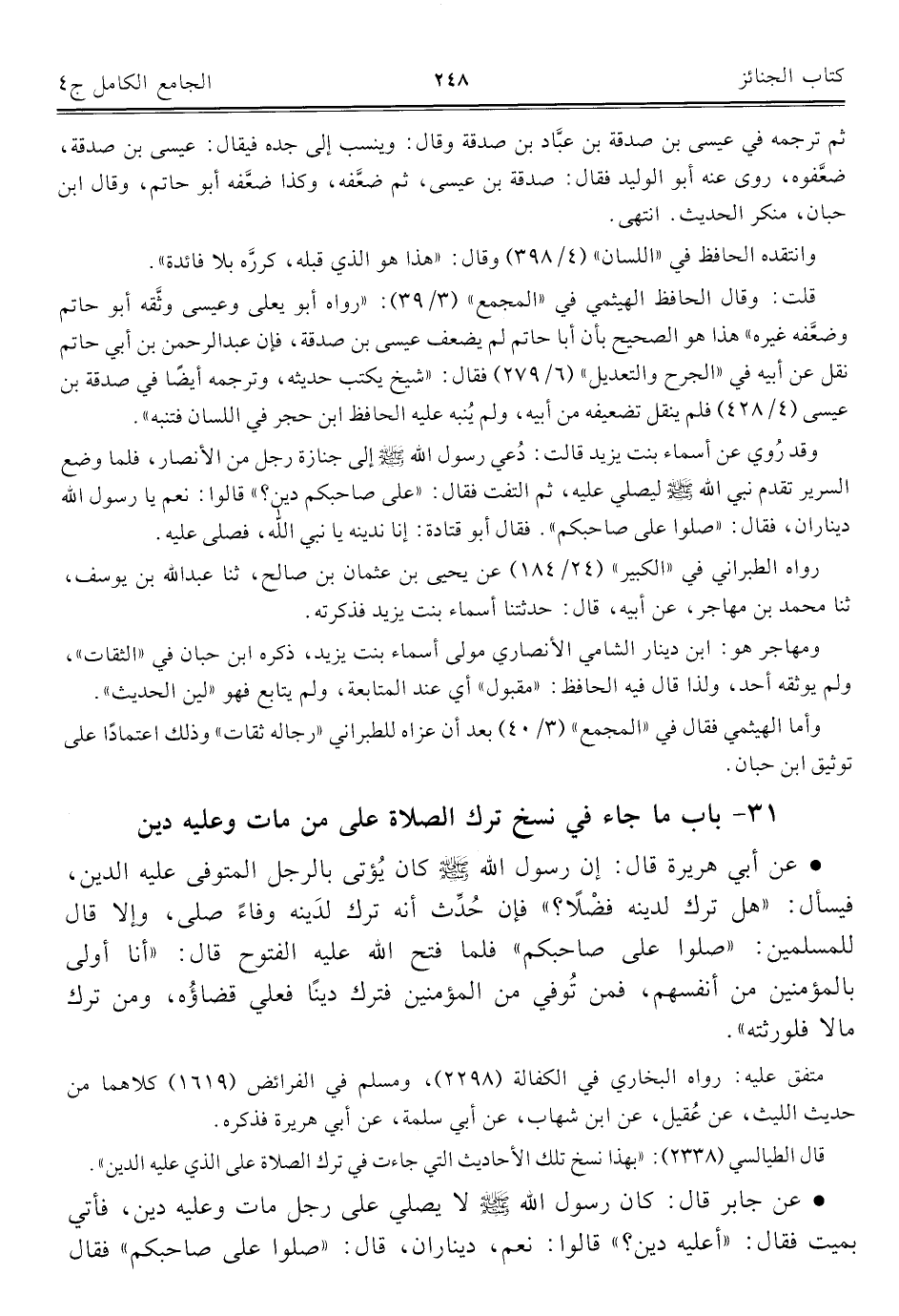• عن جابر قال: كان رسول الله صلى الله عليه وسلم لا يصلي على رجل مات وعليه دين، فأتي بميت فقال: "أعليه دين؟ " قالوا: نعم، ديناران، قال: "صلوا على صاحبكم" فقال