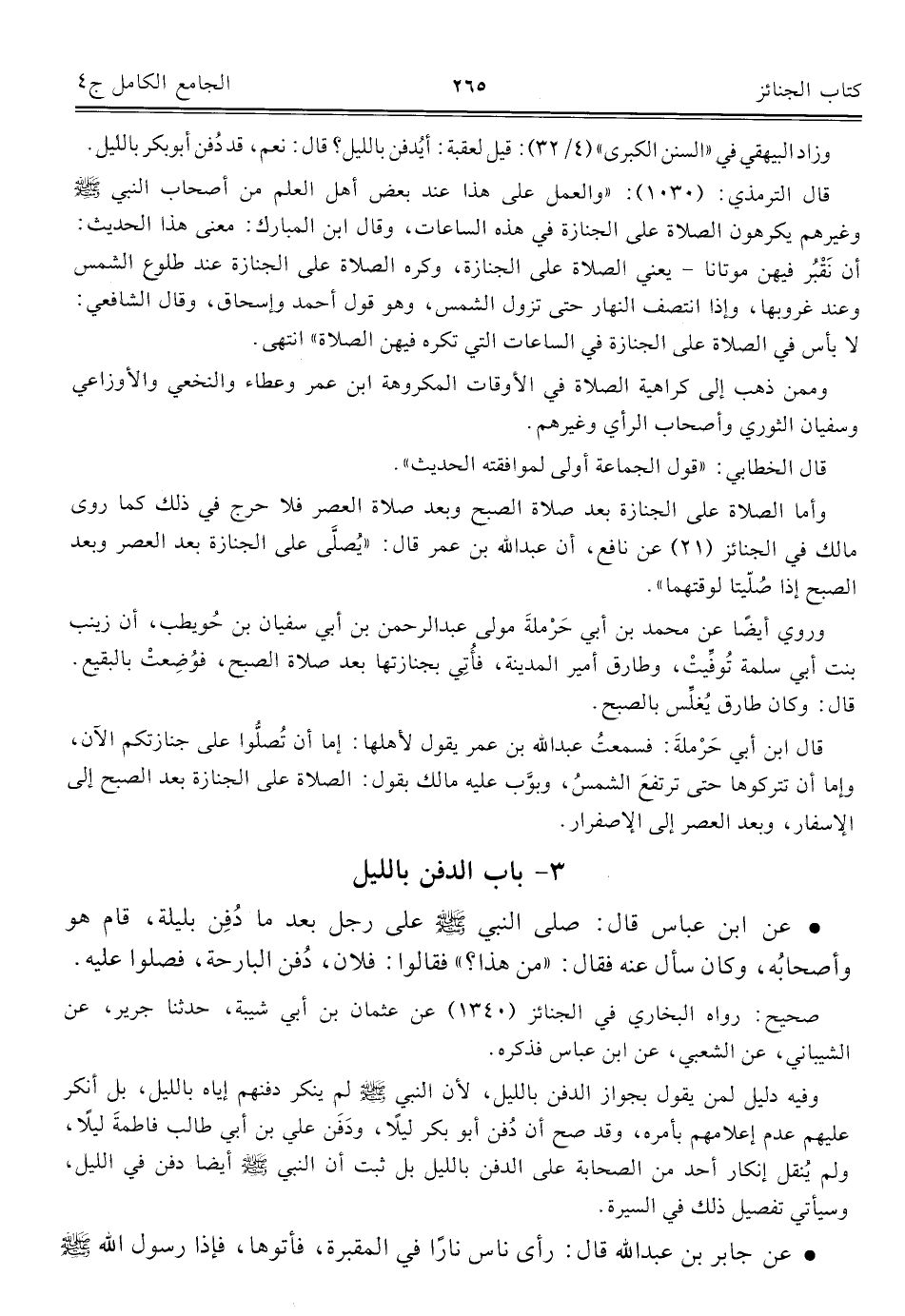 وزاد البيهقي في "السنن الكبرى" (٤/ ٣٢): قيل لعقبة: أيُدفن بالليل؟ قال: نعم، قد دُفن أبوبكر بالليل. قال الترمذي: (١٠٣٠): "والعمل على هذا عند بعض أهل العلم من أصحاب النبي - صلى الله عليه وسلم - وغيرهم يكرهون الصلاة على الجنازة في هذه الساعات، وقال ابن المبارك: معنى هذا الحديث: أن نَقبُر فيهن موتانا -يعني الصلاة على الجنازة، وكره الصلاة على الجنازة عند طلوع الشمس وعند غروبها، وإذا انتصف النهار حتى تزول الشمس، وهو قول أحمد وإسحاق، وقال الشافعي: لا بأس في الصلاة على الجنازة في الساعات التي تكره فيهن الصلاة" انتهى.