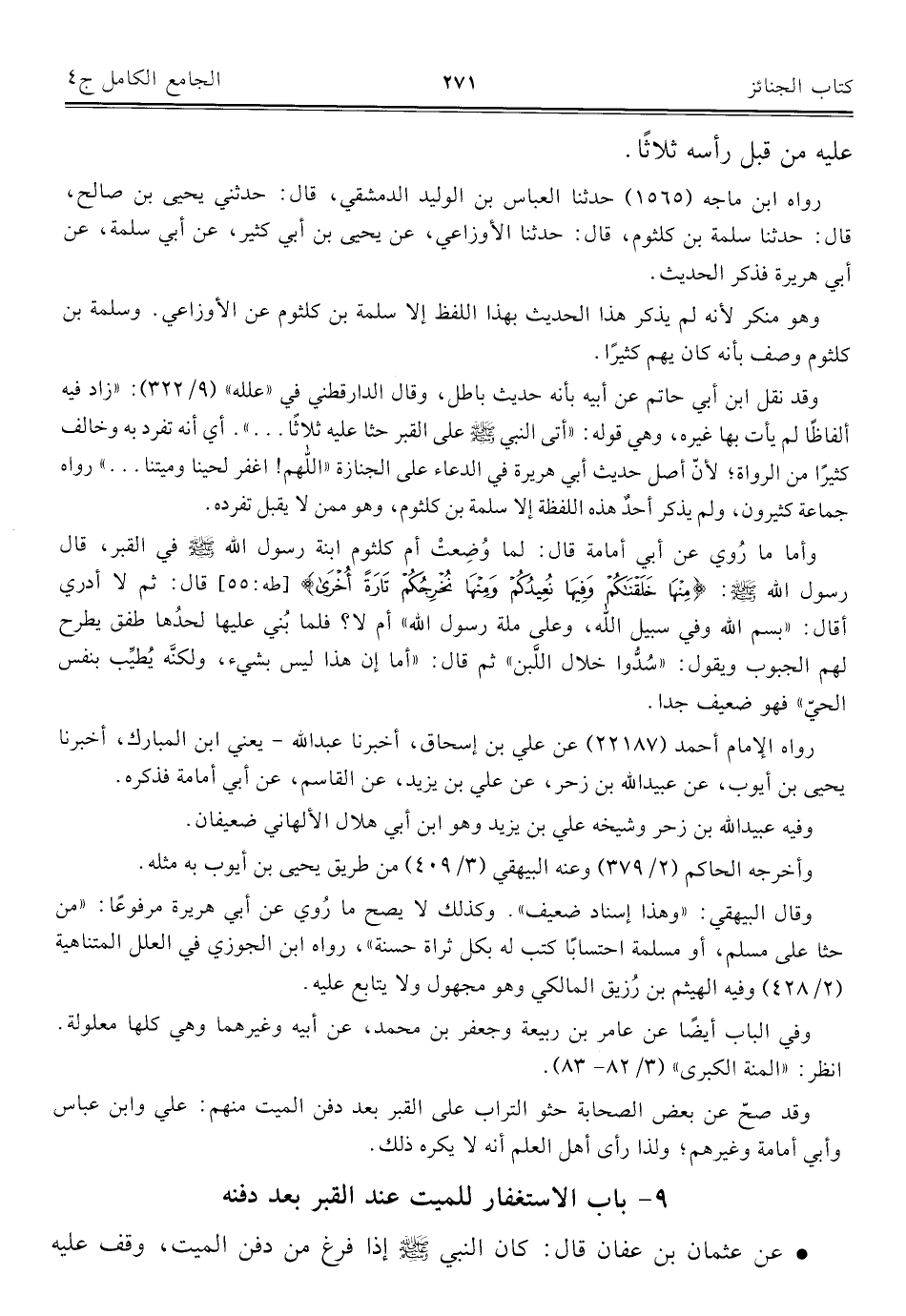 وأما ما رُوي عن أبي أمامة قال: لما وُضِعت أم كلثوم ابنة رسول الله - صلى الله عليه وسلم - في القبر، قال رسول الله - صلى الله عليه وسلم -: {مِنْهَا خَلَقْنَاكُمْ وَفِيهَا نُعِيدُكُمْ وَمِنْهَا نُخْرِجُكُمْ تَارَةً أُخْرَى} [طه: ٥٥] قال: ثم لا أدري أقال: "بسم الله وفي سبيل الله، وعلى ملة رسول الله" أم لا؟ فلما بُني عليها لحدُها طفق يطرح لهم الجبوب ويقول: "سُدُّوا خلال اللَّبن" ثم قال: "أما إن هذا ليس بشيء، ولكنَّه يُطيِّب بنفس الحيّ" فهو ضعيف جدا.