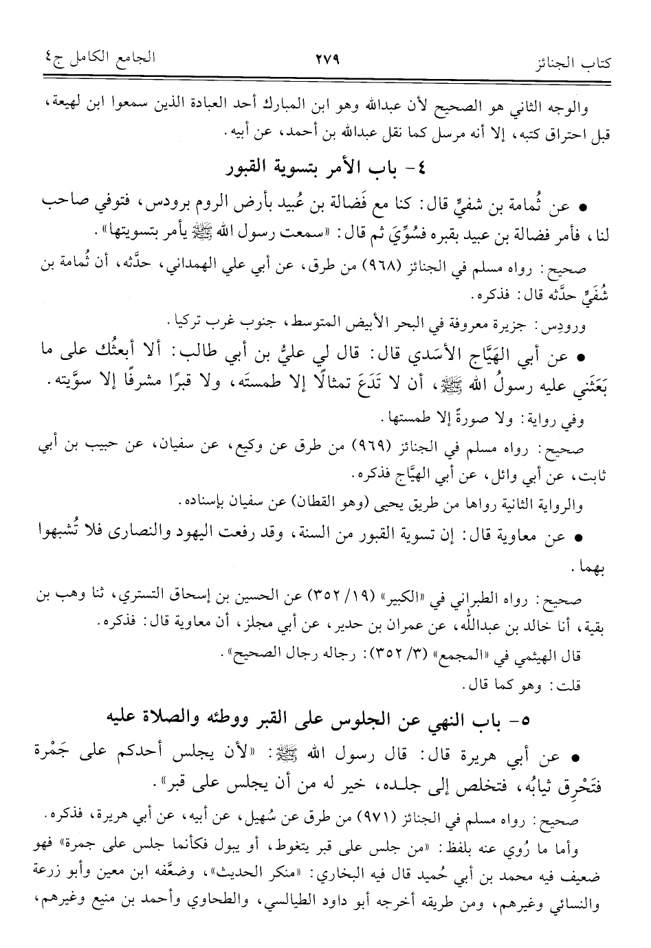 • عن أبي الهَيَّاج الأسَدي قال: قال لي عليُّ بن أبي طالب: ألا أبعثُك على ما بَعَثَي عليه رسولُ الله - صلى الله عليه وسلم -، أن لا تَدَعَ تمثالًا إلا طمستَه، ولا قبرًا مشرقًا إلا سوَّيته.