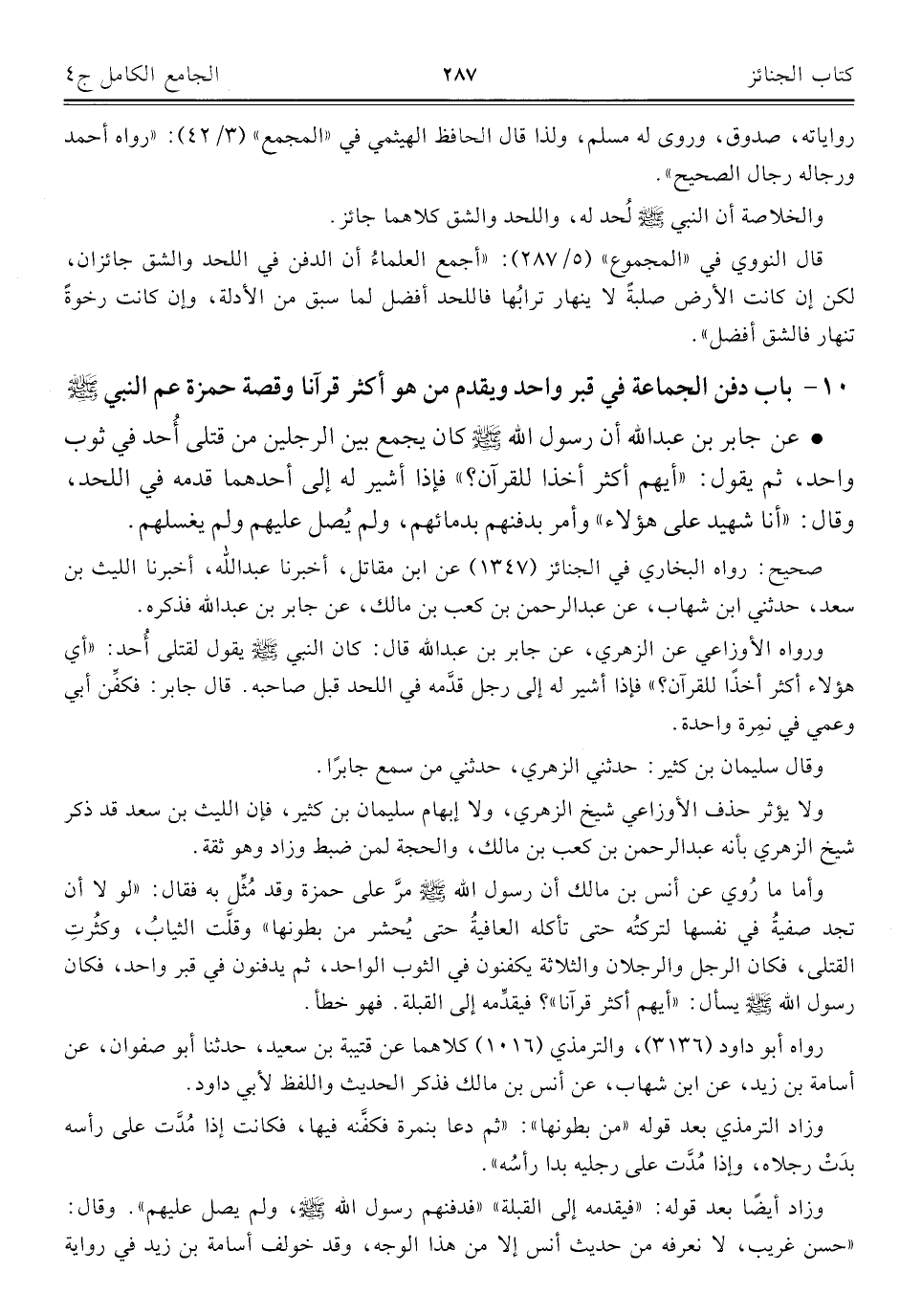 ١٠ - باب دفن الجماعة في قبر واحد ويقدم من هو أكثر قرآنا وقصة حمزة عم النبي - صلى الله عليه وسلم -