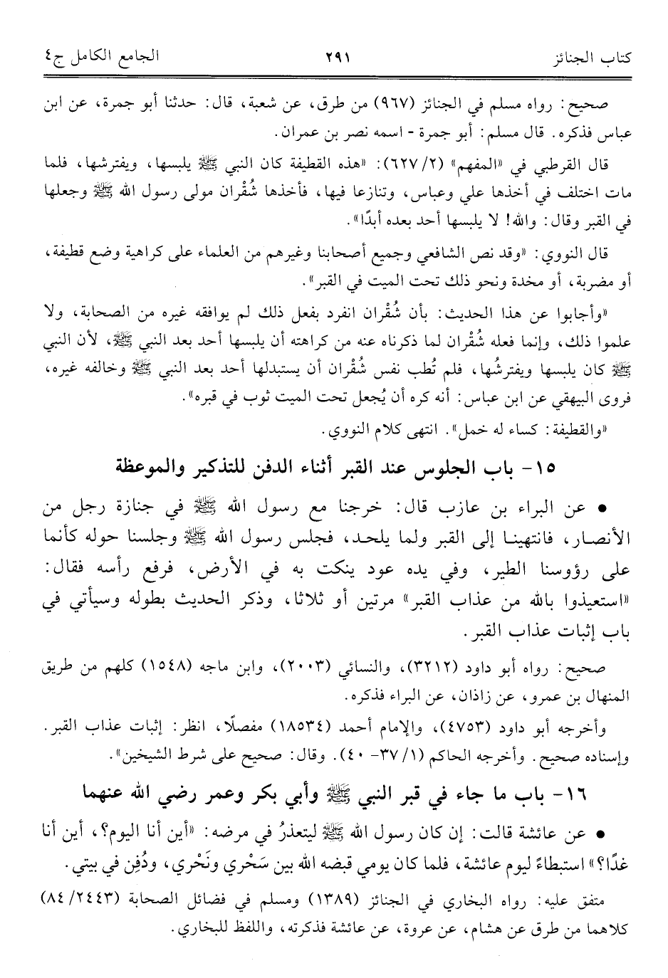 "وأجابوا عن هذا الحديث: بأن شُقْران انفرد بفعل ذلك لم يوافقه غيره من الصحابة، ولا علموا ذلك، وإنما فعله شُقْران لما ذكرناه عنه من كراهته أن يلبسها أحد بعد النبي - صلى الله عليه وسلم -، لأن النبي - صلى الله عليه وسلم - كان يلبسها ويفترشُها، فلم تُطب نفس شُقْران أن يستبدلها أحد بعد النبي - صلى الله عليه وسلم - وخالفه غيره، فروى البيهقي عن ابن عباس: أنه كره أن يُجعل تحت الميت ثوب في قبره".