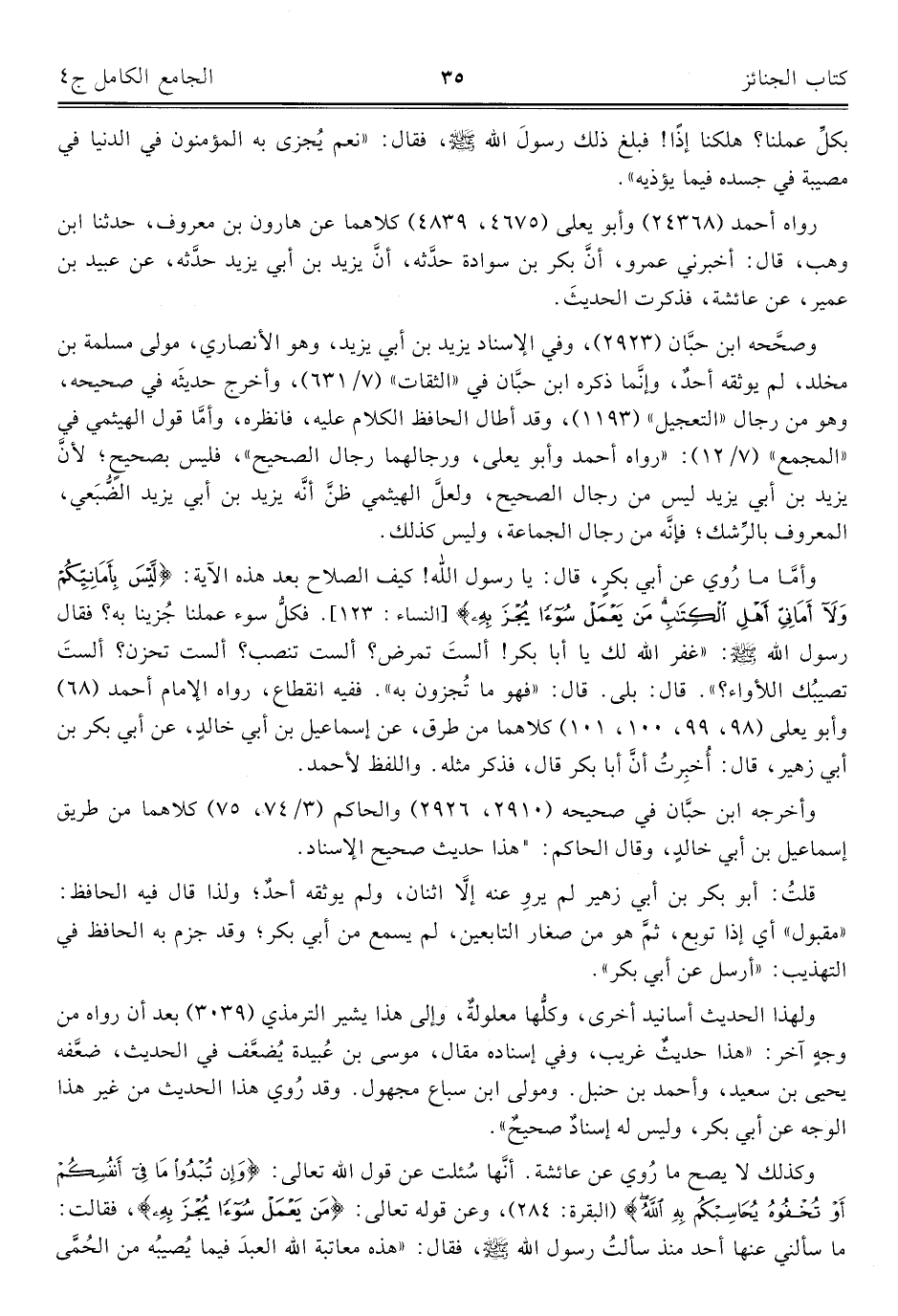 وأمَّا ما رُوي عن أبي بكر، قال: يا رسول الله! كيف الصلاح بعد هذه الآية: {لَيْسَ بِأَمَانِيِّكُمْ وَلَا أَمَانِيِّ أَهْلِ الْكِتَابِ مَنْ يَعْمَلْ سُوءًا يُجْزَ بِهِ} [النساء: ١٢٣]. فكلُّ سوء عملنا جُزينا به؟ فقال رسول الله - صلى الله عليه وسلم -: "غفر الله لك يا أبا بكر! ألستَ تمرض؟ ألست تنصب؟ ألست تحزن؟ ألستَ تصيبُك اللأواء؟ ". قال: بلى. قال: "فهو ما تُجزون به". ففيه انقطاع، رواه الإمام أحمد (٦٨) وأبو يعلى (٩٨, ٩٩, ١٠٠, ١٠١) كلاهما من طرق، عن إسماعيل بن أبي خالدٍ، عن أبي بكر بن أبي زهير، قال: أُخبِرتُ أنَّ أبا بكر قال، فذكر مثله. واللفظ لأحمد.