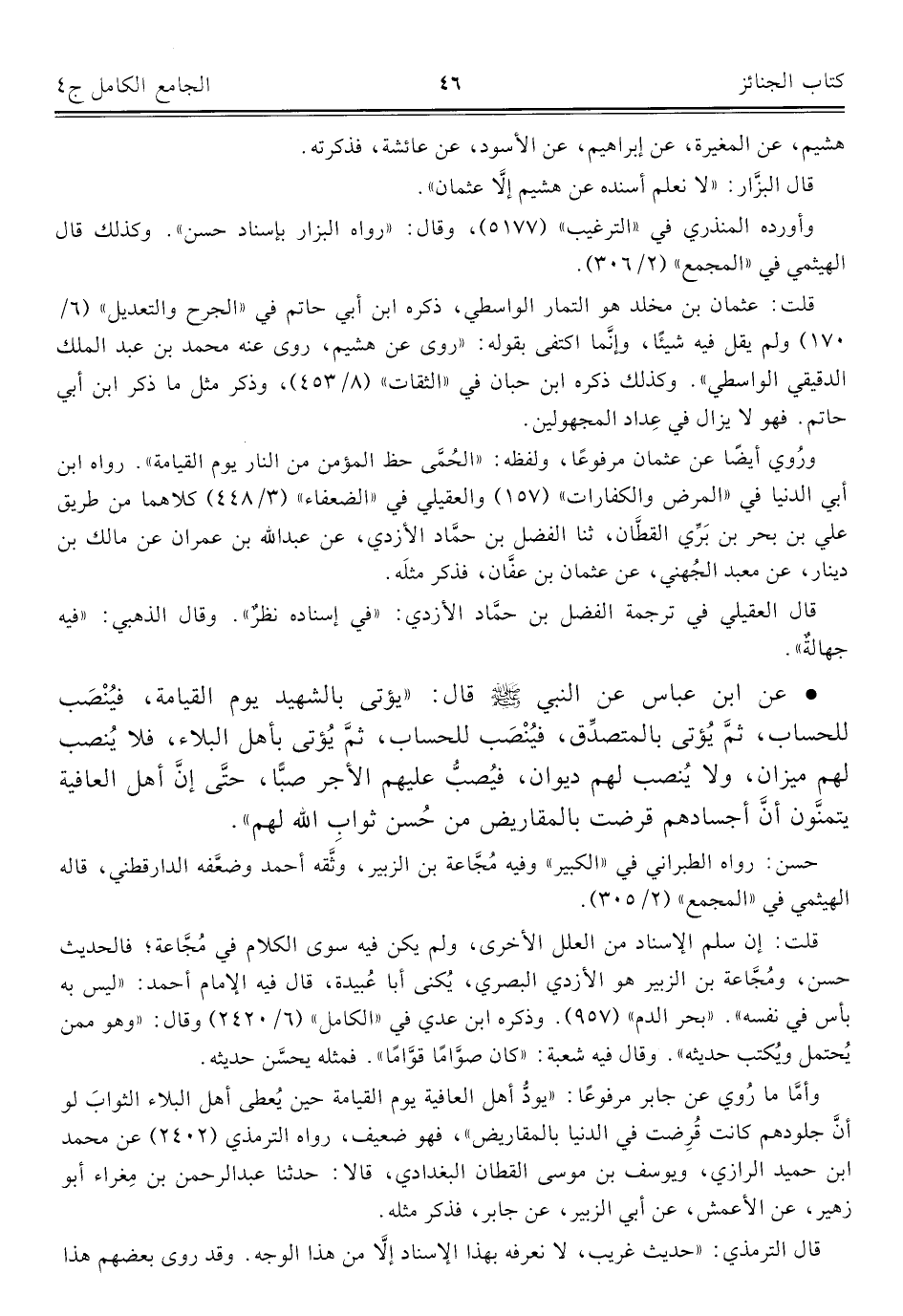 وأمَّا ما رُوي عن جابر مرفوعًا: "يودُّ أهل العافية يوم القيامة حين يُعطى أهل البلاء الثوابَ لو أنَّ جلودهم كانت قُرِضت في الدنيا بالمقاريض"، فهو ضعيف، رواه الترمذي (٢٤٠٢) عن محمد ابن حميد الرازي، ويوسف بن موسى القطان البغدادي، قالا: حدَّثنا عبد الرحمن بن مِغراء أبو زهير، عن الأعمش، عن أبي الزبير، عن جابر، فذكر مثله.