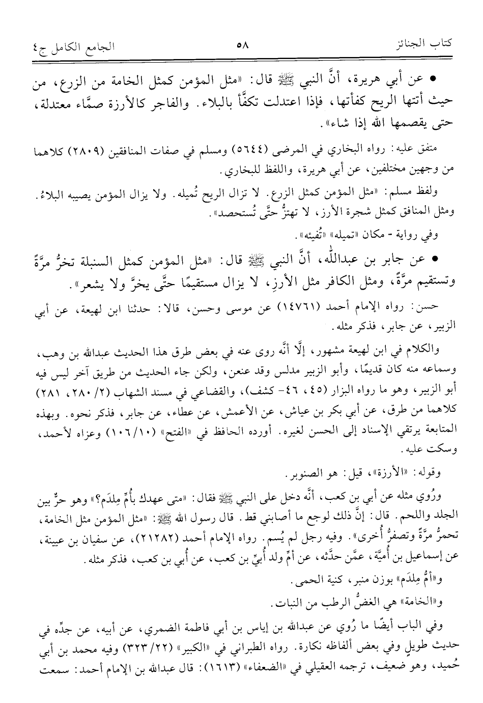 • عن جابر بن عبد الله، أنَّ النَّبِيّ صلى الله عليه وسلم قال: "مثل المؤمن كمثل السنبلة تخرُّ مرَّةً وتستقيم مرَّةً، ومثل الكافر مثل الأرزِ، لا يزال مستقيمًا حتَّى يخرَّ ولا يشعر".