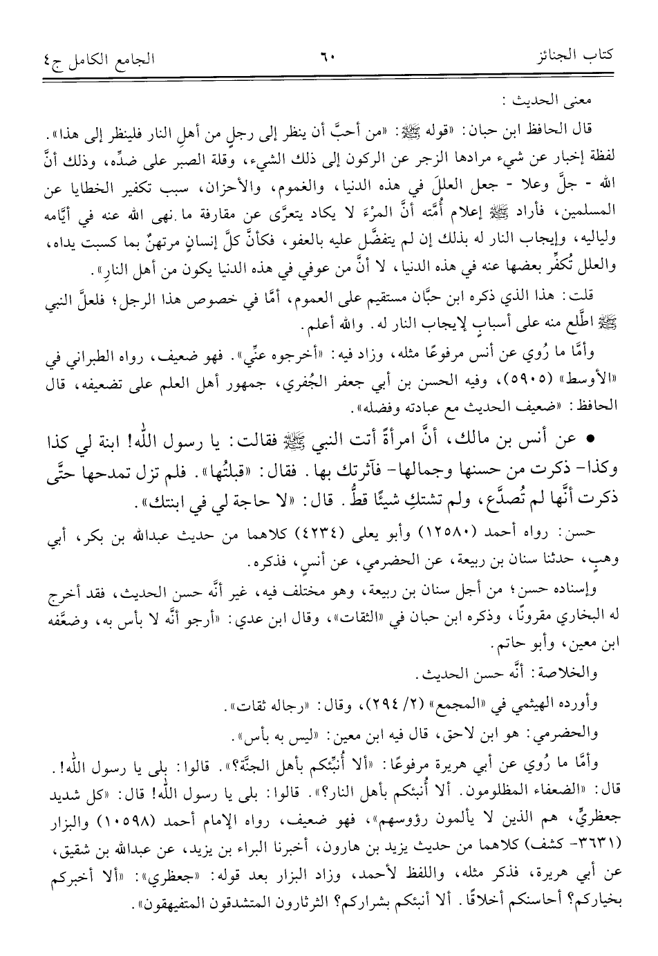 قال الحافظ ابن حبَّان: "قوله - صلى الله عليه وسلم -: "من أحبَّ أن ينظر إلى رجلٍ من أهل النّار فلينظر إلى هذا". لفظة إخبار عن شيء مرادها الزجر عن الركون إلى ذلك الشيء، وقلة الصبر على ضدّه، وذلك أنَّ الله -جلَّ وعلا- جعل العللَ في هذه الدُّنيا، والغموم، والأحزان، سبب تكفير الخطايا عن المسلمين، فأراد - صلى الله عليه وسلم - إعلام أُمَّته أنَّ المرْءَ لا يكاد يتعرَّى عن مقارفة ما نهى الله عنه في أيَّامه ولياليه، وإيجاب النّار له بذلك إن لم يتفضَّل عليه بالعفو، فكأنَّ كلَّ إنسانٍ مرتهنٌ بما كسبت يداه، والعلل تُكفِّر بعضها عنه في هذه الدُّنيا، لا أنَّ من عوفي في هذه الدُّنيا يكون من أهل النّارِ".