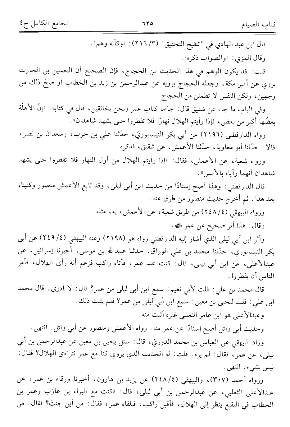 وزاد البيهقي عن العباس بن محمد الدوريّ، قال: سئل يحيى بن معين عن عبد الرحمن بن أبي ليلى، عن عمر، فقال: لم يره. قلت: له الحديث الذي يروي كنا مع عمر نتراءى الهلال؟ فقال: ليس بشيء. انتهى.