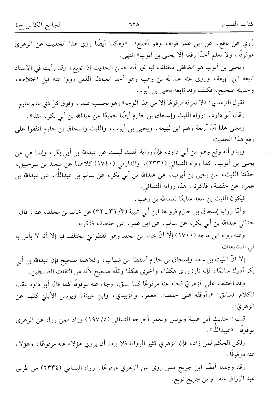 رُوي عن نافع، عن ابن عمر قوله، وهو أصح". "وهكذا أيضًا روي هذا الحديث عن الزهري موقوفًا، ولا نعلم أحدًا رفعه إلّا يحيى بن أيوب" انتهي.