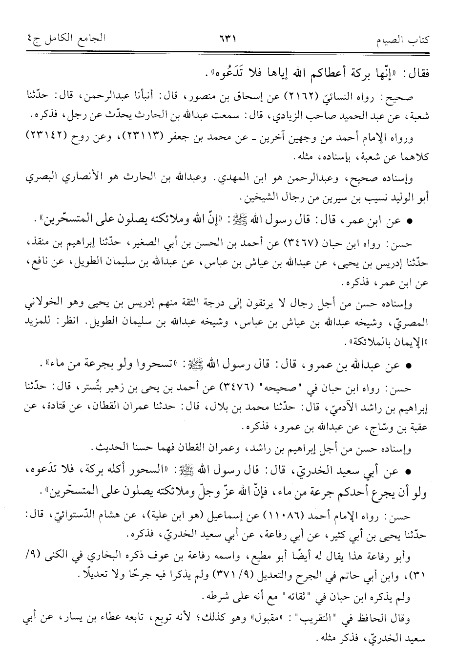 • عن ابن عمر، قال: قال رسول الله صلى الله عليه وسلم: "إن الله وملائكته يصلون على المتسحّرين".