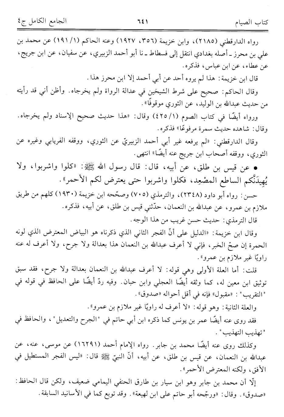 وقال ابن خزيمة: "الدليل على أنّ الفجر الثاني الذي ذكرناه هو البياض المعترض الذي لونه الحمرة إن صحّ الخبر، فإني لا أعرف عبد الله بن النعمان هذا بعدالة ولا جرح، ولا أعرف له عنه راويًا غير ملازم بن عمرو".