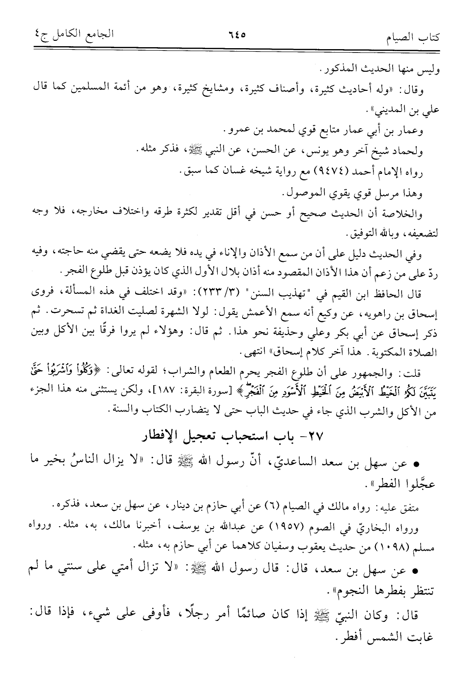 قلت: والجمهور على أن طلوع الفجر يحرم الطعام والشراب؛ لقوله تعالى: {وَكُلُوا وَاشْرَبُوا حَتَّى يَتَبَيَّنَ لَكُمُ الْخَيْطُ الْأَبْيَضُ مِنَ الْخَيْطِ الْأَسْوَدِ مِنَ الْفَجْرِ} [سورة البقرة: ١٨٧]، ولكن يستثني منه هذا الجزء من الأكل والشرب الذي جاء في حديث الباب حتى لا يتضارب الكتاب والسنة.