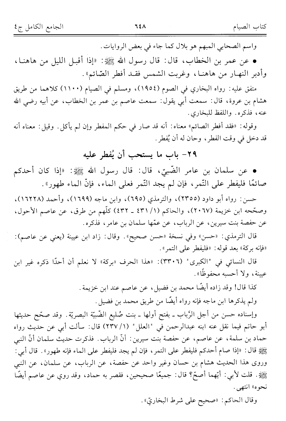 وإسناده حسن من أجل الرَّباب -بفتح أولها- بنت صُليع الضّبيّة البصريّة. وقد صحّح حديثها أبو حاتم فيما نقل عنه ابنه عبد الرحمن في "العلل" (١/ ٢٣٧) قال: سألت أبي عن حديث رواه حماد بن سلمة، عن عاصم، عن حفصة بنت سيرين: أنّ الرباب. فذكرت حديث سلمان أنّ النبي صلى الله عليه وسلم قال: "إذا صام أحدكم فليفطر على التمر، فإن لم يجد فليفطر على الماء فإنه طهور". قال أبي: وروى هذا الحديث هشام بن حسان وغير واحد عن حفصة، عن الرباب، عن سلمان، عن النبي - صلى الله عليه وسلم -. قلت لأبي: أيّهما أصح؟ قال: جميعًا صحيحين، فقصر به حماد، وقد روي عن عاصم أيضًا نحوه" انتهى.