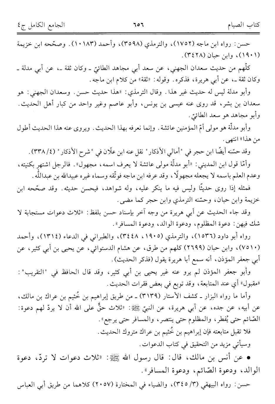 • عن أنس بن مالك، قال: قال رسول الله - صلى الله عليه وسلم -: "ثلاث دعوات لا تردّ، دعوة الوالد، ودعوة الصّائم، ودعوة المسافر".