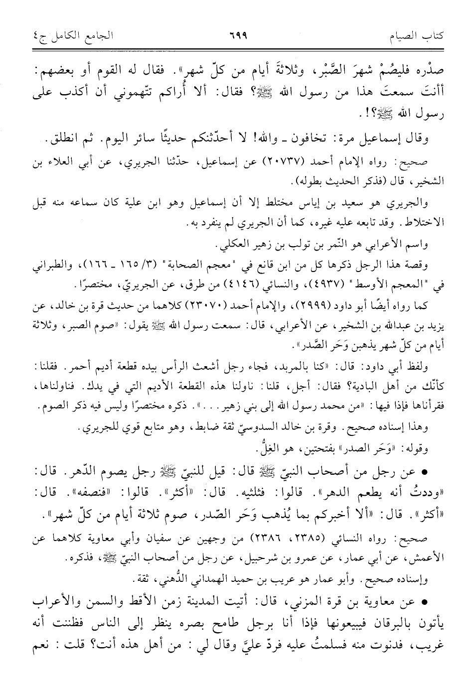 كما رواه أيضًا أبو داود (٢٩٩٩)، والإمام أحمد (٢٣٠٧٠) كلاهما من حديث قرة بن خالد، عن يزيد بن عبد الله بن الشخير، عن الأعرابي، قال: سمعت رسول الله صلى الله عليه وسلم يقول: "صوم الصبر، وثلاثة أيام من كلّ شهر يذهبن وَحَر الصَّدر".