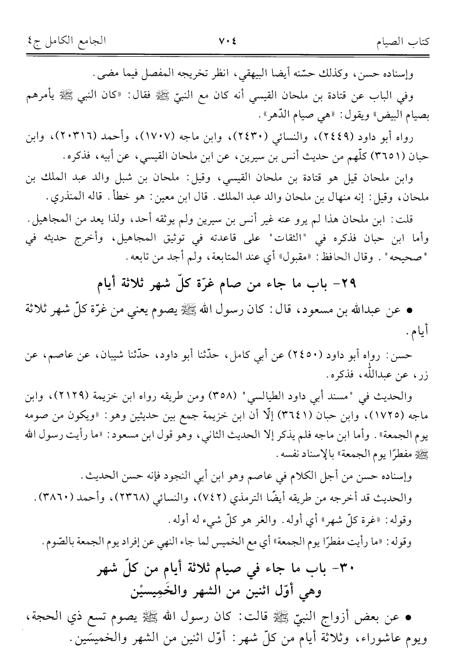 • عن عبد الله بن مسعود، قال: كان رسول الله صلى الله عليه وسلم يصوم يعني من غرّة كلّ شهر ثلاثة أيام.