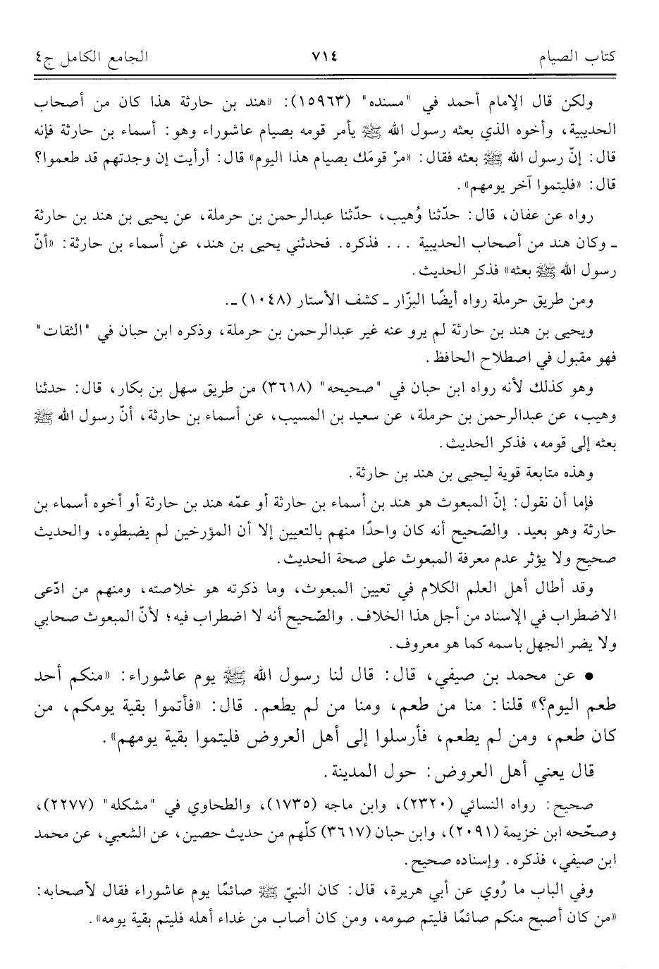 ولكن قال الإمام أحمد في "مسند" (١٥٩٦٣): "هند بن حارثة هذا كان من أصحاب الحديبية، وأخوه الذي بعثه رسول الله صلى الله عليه وسلم يأمر قومه بصيام عاشوراء وهو: أسماء بن حارثة فإنه قال: إنّ رسول الله - صلى الله عليه وسلم - بعثه فقال: "مرْ قومَك بصيام هذا اليوم" قال: أرأيت إن وجدتهم قد طعموا؟ قال: "فليتموا آخر يومهم".