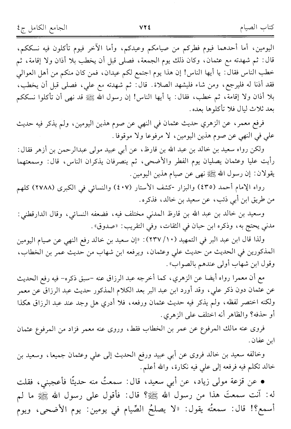 ولكن رواه سعيد بن خالد بن عبد الله بن قارظ، عن أبي عبيد مولي عبد الرحمن بن أزهر فقال: رأيت عليا وعثمان يصليان يوم الفطر والأضحى، ثم ينصرفان يذكر ان الناس، قال: وسمعتهما يقولان: إن رسول الله - صلى الله عليه وسلم - نهى عن صيام هذين اليومين.