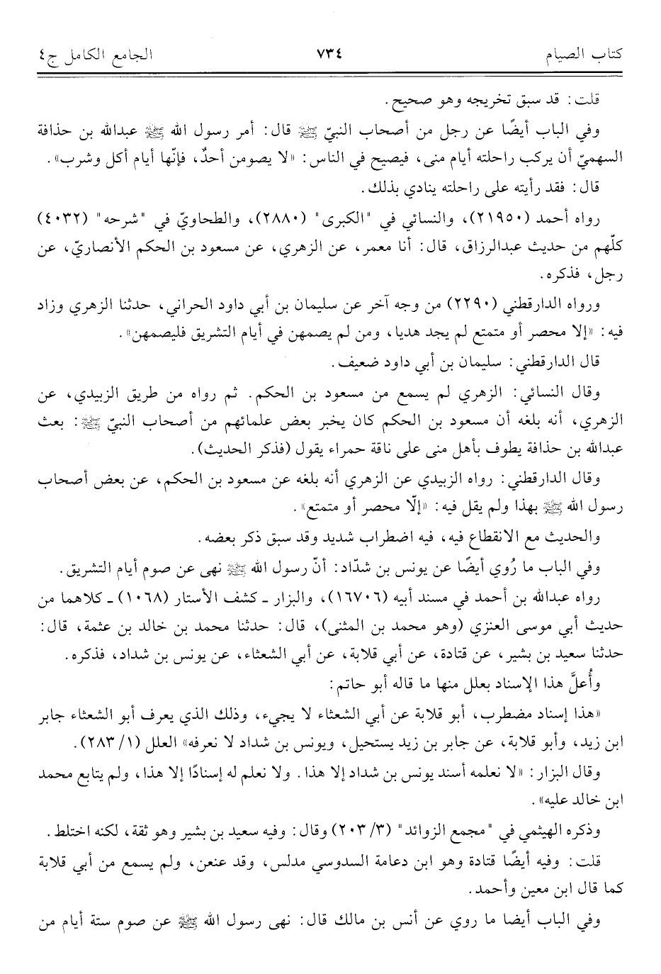 ورواه الدارقطني (٢٢٩٠) من وجه آخر عن سليمان بن أبي داود الحراني، حدّثنا الزهري وزاد فيه: "إلا محصر أو متمتع لم يجد هديا، ومن لم يصمهن في أيام التشريق فليصمهن".