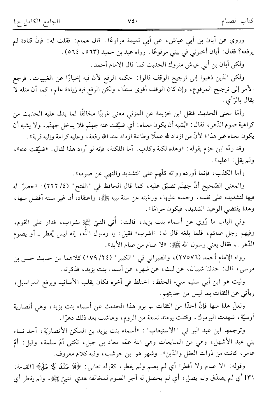 وفي الباب ما رُوي عن أسماء بنت يزيد، قالت: أُتي النبيّ - صلى الله عليه وسلم - بشراب، فدار على القوم، وفيهم رجل صائم، فلما بلغه قال له: "اشرب، فقيل: يا رسول الله، إنه ليس يُفطر - أو يصوم الدّهر-، فقال يعني رسول الله - صلى الله عليه وسلم -: "لا صام من صام الأبد".
