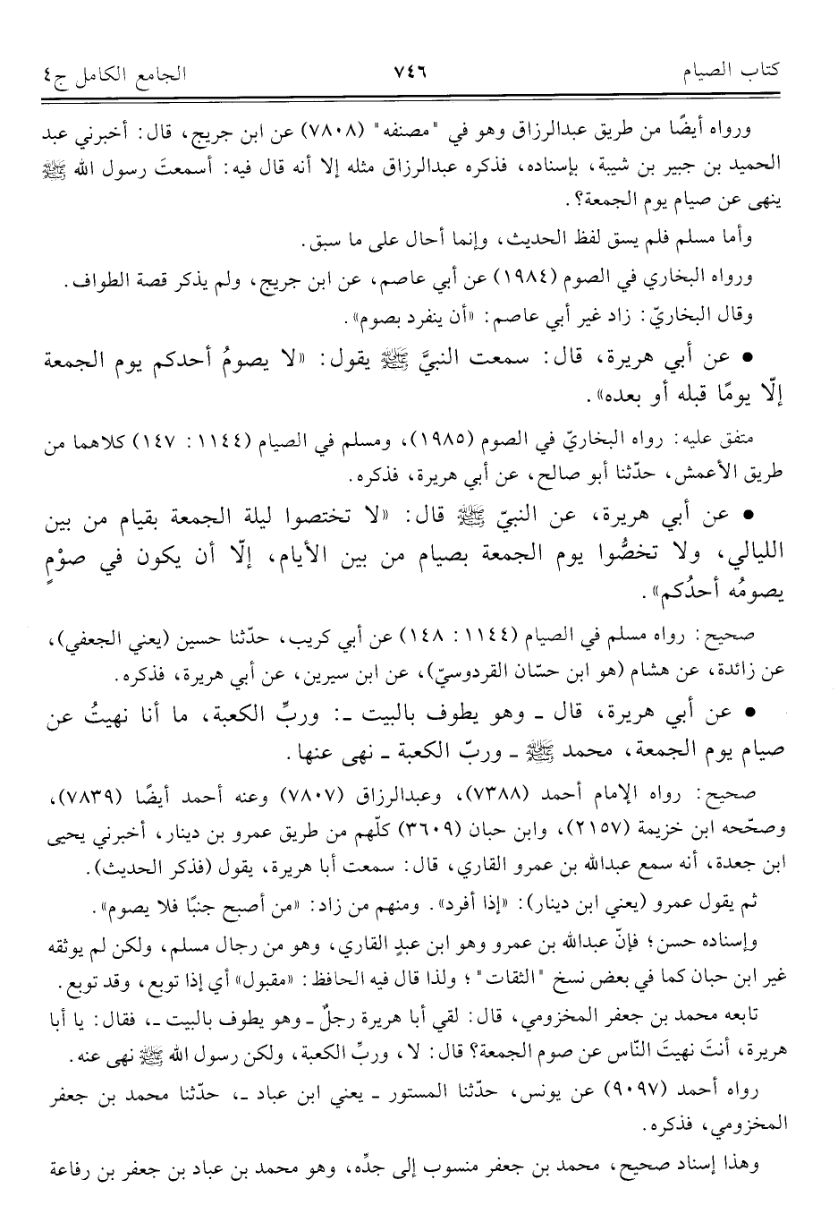 تابعه محمد بن جعفر المخزومي، قال: لقي أبا هريرة رجلٌ -وهو يطوف بالبيت-، فقال: يا أبا هريرة، أنتَ نهيتَ النّاس عن صوم الجمعة؟ قال: لا، وربَّ الكعبة، ولكن رسول الله - صلى الله عليه وسلم - نهي عنه.