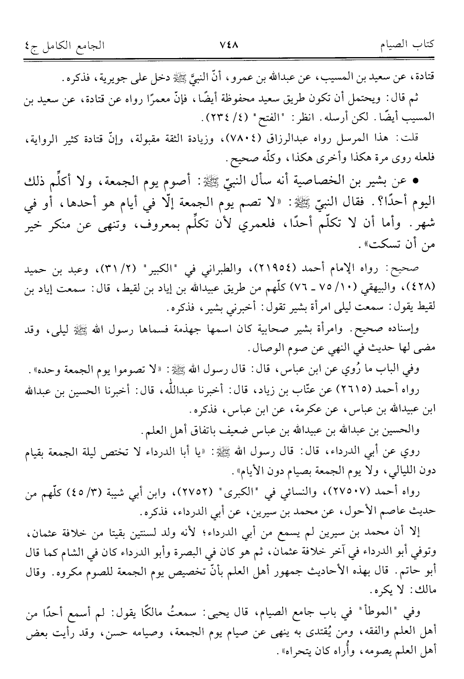 إلا أن محمد بن سيرين لم يسمع من أبي الدرداء؛ لأنه ولد لسنتين بقينا من خلافة عثمان، وتوفي أبو الدرداء في آخر خلافة عثمان، ثم هو كان في البصرة وأبو الدرداء كان في الشام كما قال أبو حاتم. قال بهذه الأحاديث جمهور أهل العلم بأن تخصيص يوم الجمعة للصوم مكروه. وقال مالك: لا يكره.
