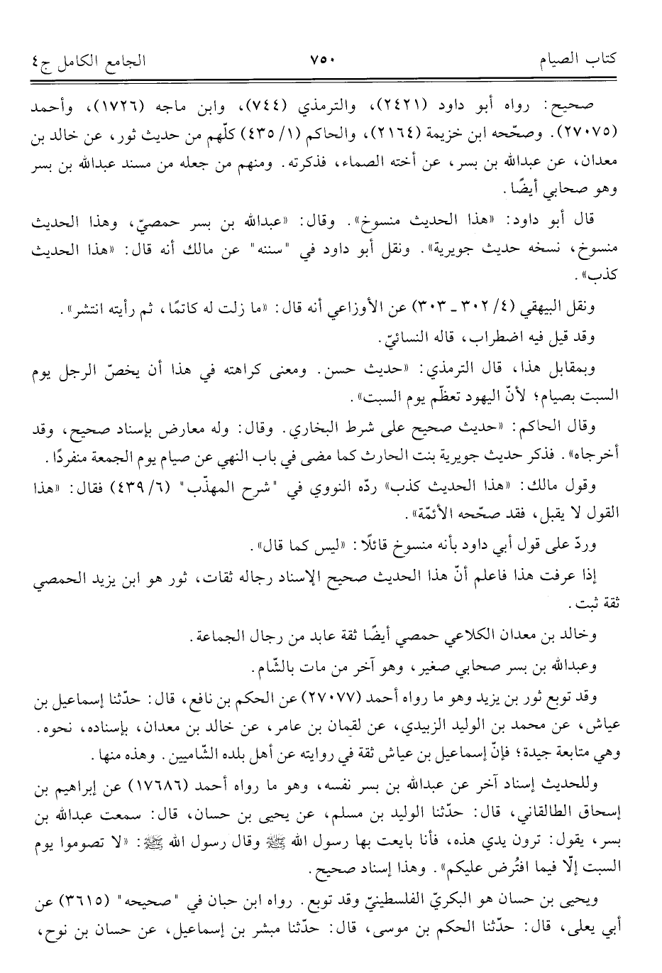 وبمقابل هذا، قال الترمذي: "حديث حسن. ومعني كراهته في هذا أن يخصّ الرجل يوم السبت بصيام؛ لأنّ اليهود تعظّم يوم السبت".