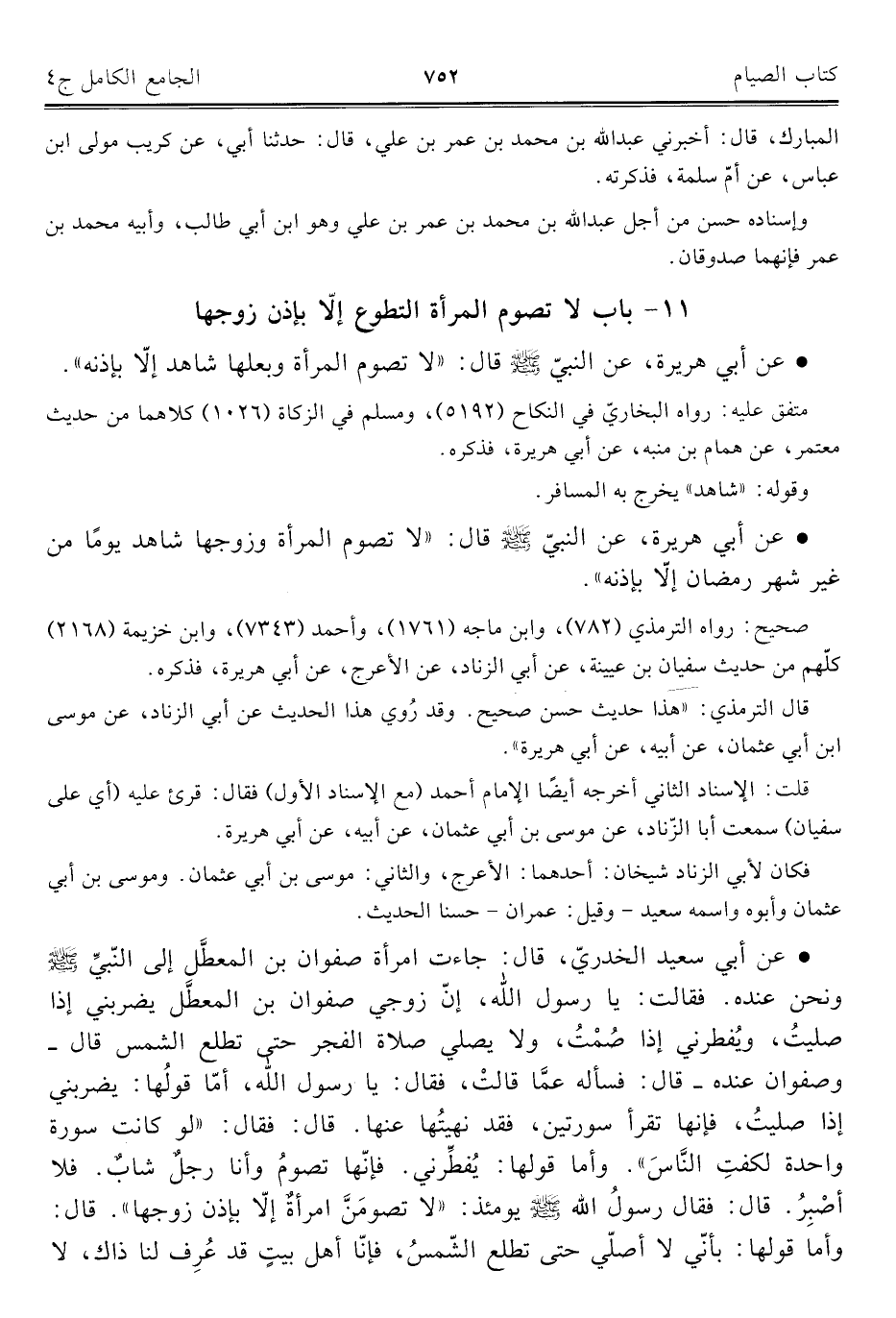 • وعن أبي هريرة، عن النبيّ - صلى الله عليه وسلم - قال: "لا تصوم المرأة وبعلها شاهد إلّا بإذنه".