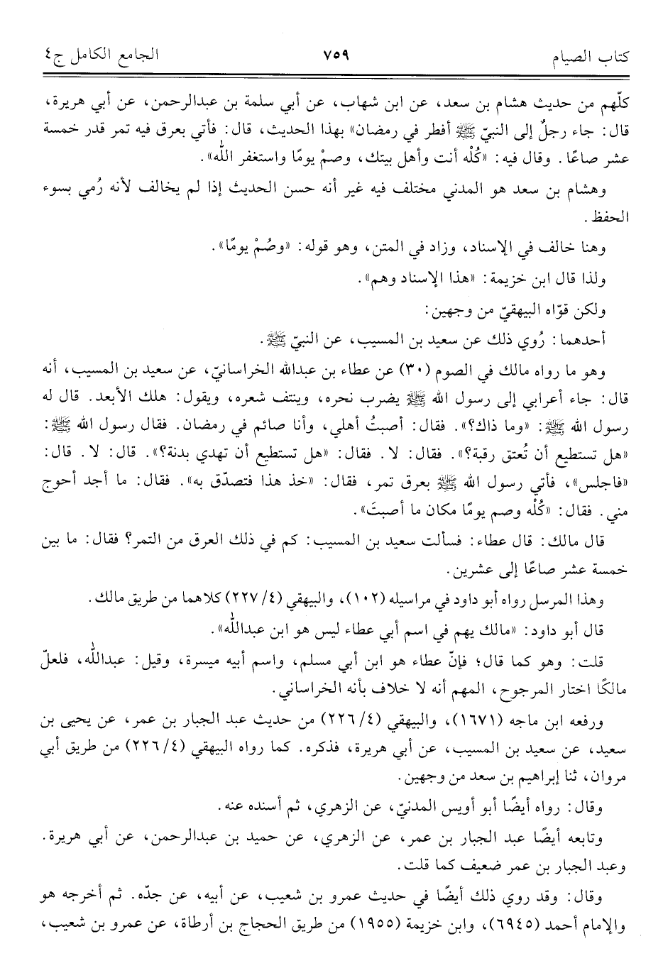 كلّهم من حديث هشام بن سعد، عن ابن شهاب، عن أبي سلمة بن عبد الرحمن، عن أبي هريرة، قال: جاء رجلٌ إلى النبي - صلى الله عليه وسلم - أفطر في رمضان" بهذا الحديث، قال: فأتي بعرق فيه تمر قدر خمسة عشر صاعًا. وقال فيه: "كُلْه أنت وأهل بيتك، وصمْ يومًا واستغفر الله".