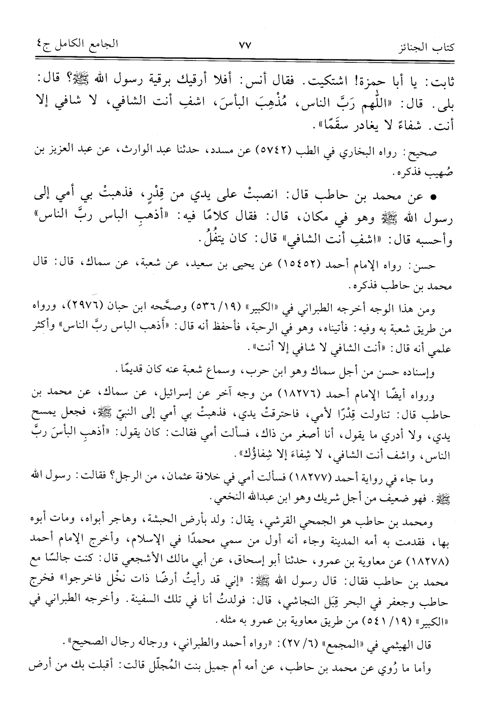 ورواه أيضًا الإمام أحمد (١٨٢٧٦) من وجه آخر عن إسرائيل، عن سماك، عن محمد بن حاطب قال: تناولت قِدْرًا لأمي، فاحترقَتْ يدي، فذهبتْ بي أمي إلى النبيّ، فجعل يمسح يدي، ولا أدري ما يقول، أنا أصغر من ذاك، فسألت أمي فقالت: كان يقول: "أذهبِ البأسَ ربَّ الناس، واشف أنت الشافي، لا شِفاءَ إلا شِفاؤُك".