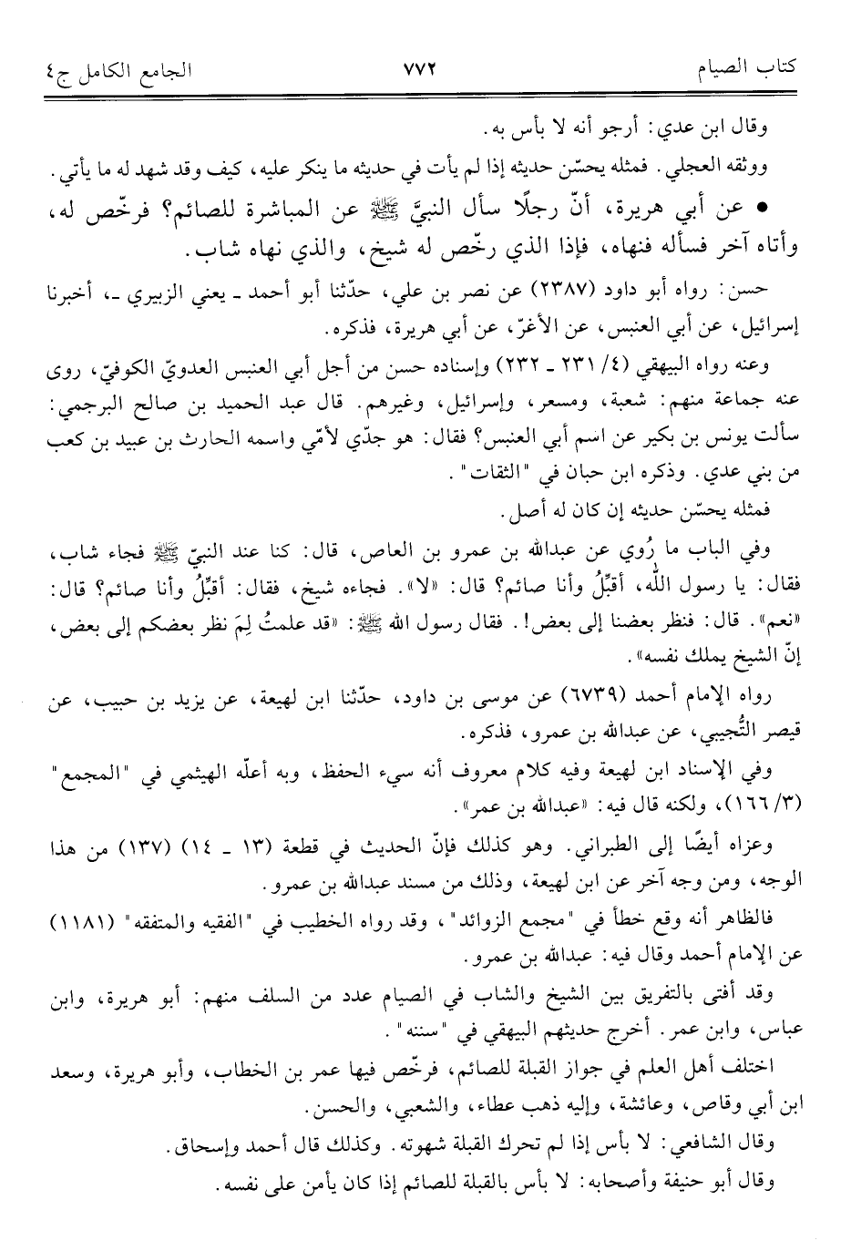 وفي الباب ما رُوي عن عبد الله بن عمرو بن العاصي، قال: كنا عند النبيّ - صلى الله عليه وسلم - فجاء شاب، فقال: يا رسول الله، أقبِّلُ وأنا صائم؟ قال: "لا". فجاءه شيخ، فقال: أقبِّلُ وأنا صائم؟ قال: "نعم". قال: فنظر بعضنا إلى بعض! . فقال رسول الله - صلى الله عليه وسلم -: "قد علمتُ لِمَ نظر بعضكم إلى بعض، إنّ الشيخ بملك نفسه".