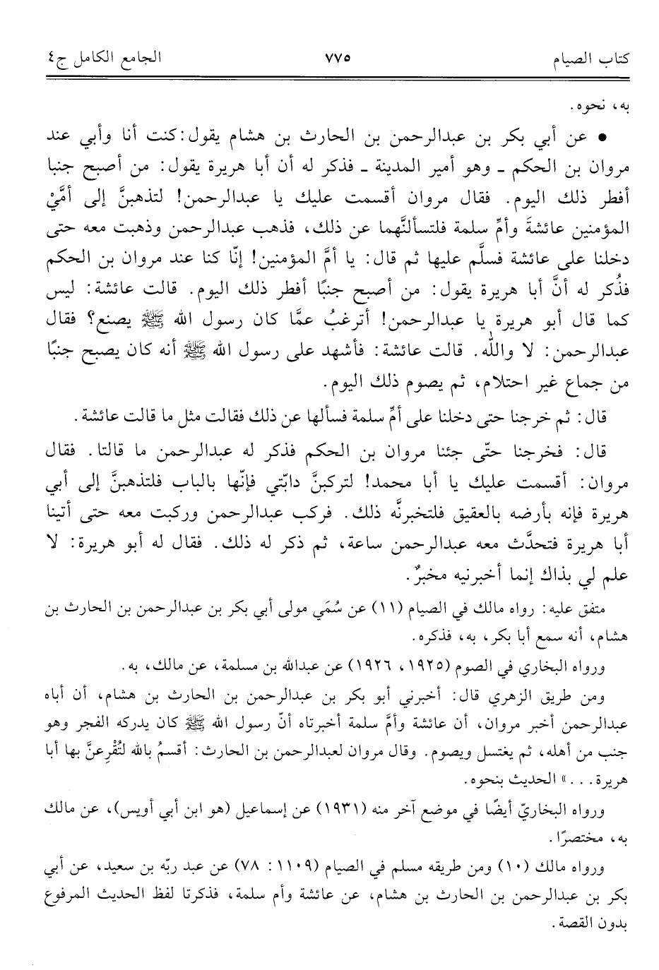• عن أبي بكر بن عبد الرحمن بن الحارث بن هشام يقول: كنت أنا وأبي عند مروان بن الحكم. وهو أمير المدينة. فذكر له أن أبا هريرة يقول: من أصبح جنبا أفطر ذلك اليوم. فقال مروان أقسمت عليك يا عبد الرحمن! لتذهبنَّ إلى أمَّيْ المؤمنين عائشةَ وأمِّ سلمة فلتسألنَّهما عن ذلك، فذهب عبد الرحمن وذهبت معه حتى دخلنا على عائشة فسلَّم عليها ثم قال: يا أمَّ المؤمنين! إنا كنا عند مروان بن الحكم فذُكر له أنَّ أبا هريرة يقول: من أصبح جنبًا أفطر ذلك اليوم. قالت عائشة: ليس كما قال أبو هريرة يا عبد الرحمن! أترغبُ عمَّا كان رسول الله - صلى الله عليه وسلم - يصنع؟ فقال عبد الرحمن: لا والله. قالت عائشة: فأشهد على رسول الله - صلى الله عليه وسلم - أنه كان يصبح جنبًا من جماع غير احتلام، ثم يصوم ذلك اليوم.