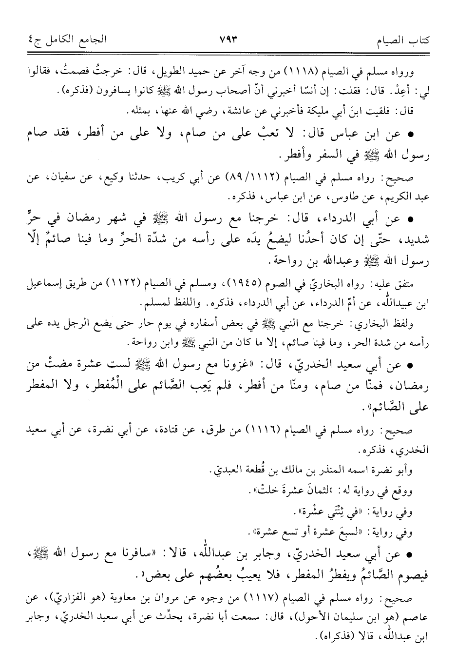 • عن أبي سعيد الخدريّ، وجابر بن عبد الله، قالا: "سافرنا مع رسول الله - صلى الله عليه وسلم -، فيصوم الصَّائمُ ويفطرُ المفطر، فلا يعيبُ بعضُهم على بعض".