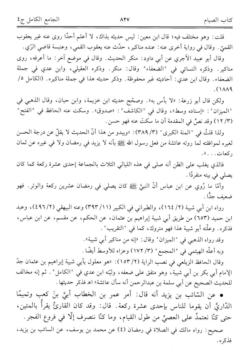 وأمّا ما رُوي عن ابن عباس أنّ النبيَّ - صلى الله عليه وسلم - كان يصلي في رمضان عشرين ركعة والوتر. فهو ضعيف جدًّا.