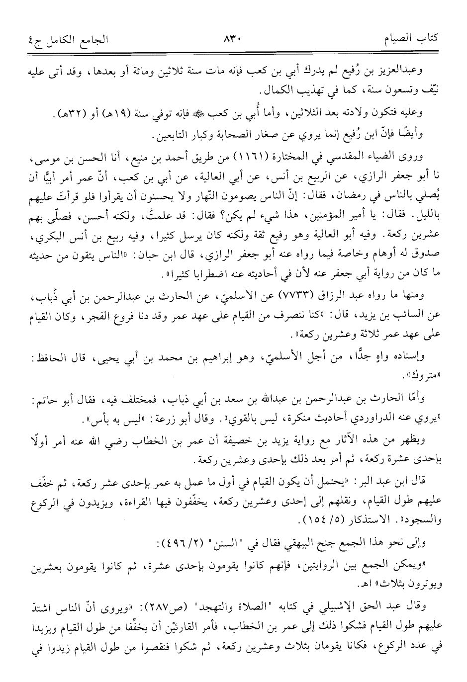 ومنها ما رواه عبد الرزاق (٧٧٣٣) عن الأسلميّ، عن الحارث بن عبد الرحمن بن أبي ذُباب، عن السائب بن يزيد، قال: "كنا نتصرف من القيام على عهد عمر وقد دنا فروع الفجر، وكان القيام على عهد عمر ثلاثة وعشرين ركعة".